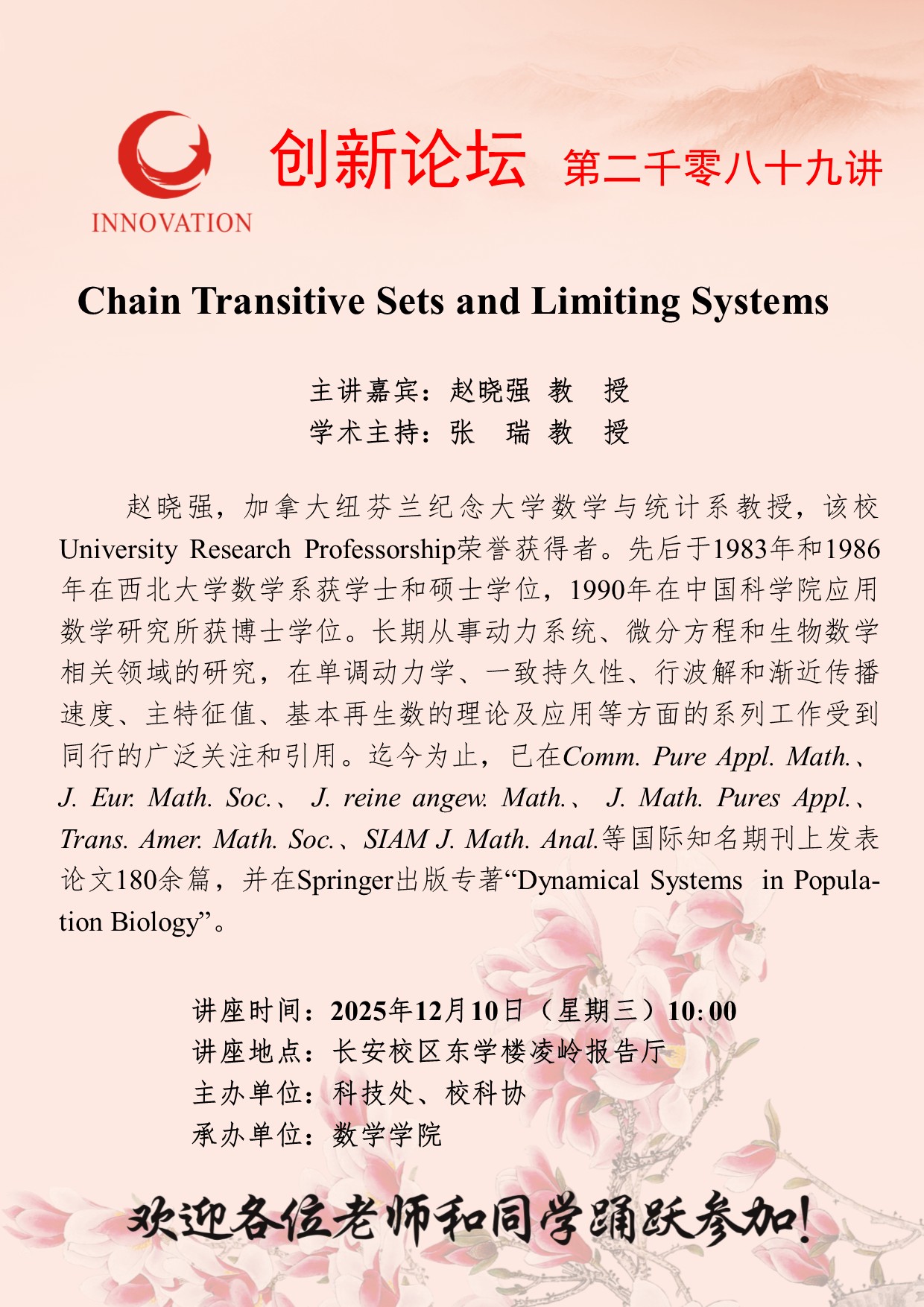 赵晓强 教授 古天乐代言太阳集团城网址创新论坛第二千零八十九讲:Chain Transitive Sets and Limiting Systems 讲座时间 2025年12月10日(星期三)10:00 讲座地点 长安校区东学楼凌岭报告厅 讲座人介绍 赵晓强 教授 讲座内容