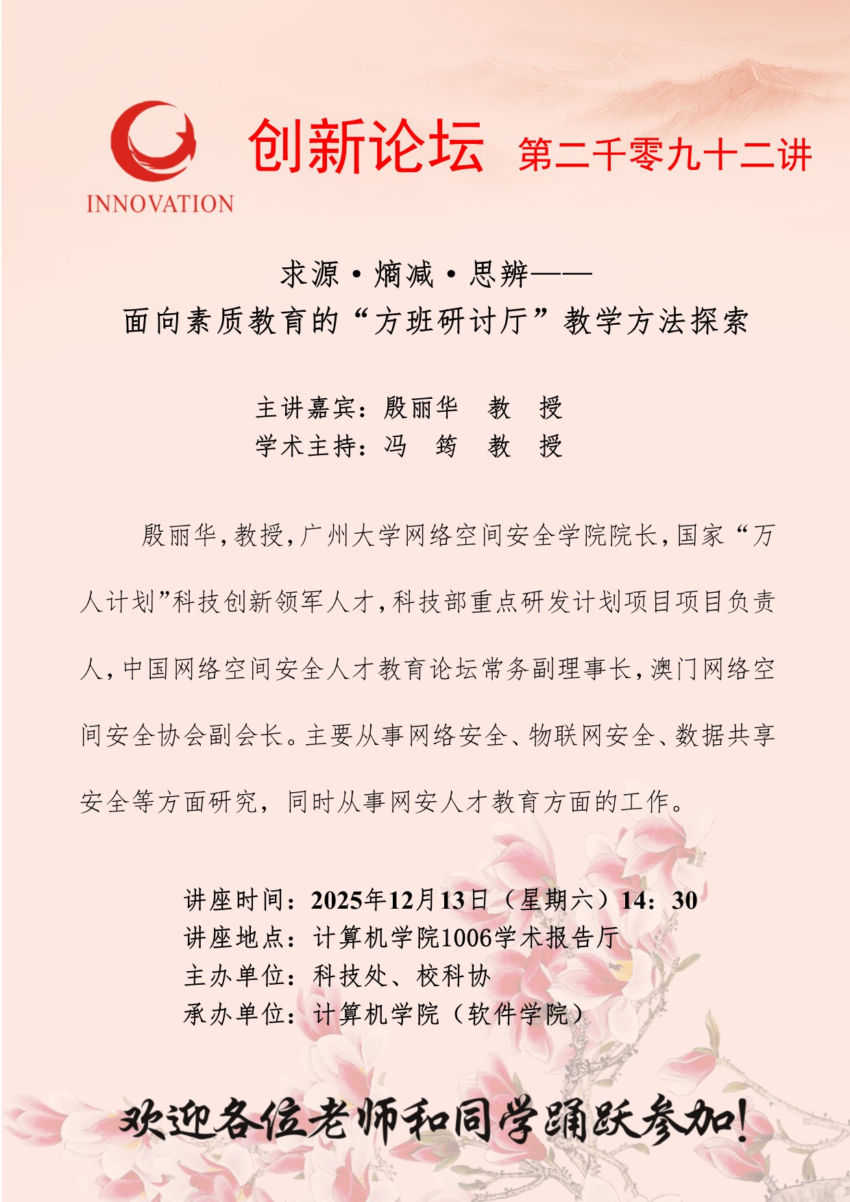殷丽华 教授 古天乐代言太阳集团城网址创新论坛第二千零九十二讲:求源·熵减·思辨——面向素质教育的“方班研讨厅”教学方法探索 讲座时间 2025年12月13日(星期六)14:30 讲座地点 计算机学院1006学术报告厅 讲座人介绍 殷丽华 教授 讲座内容