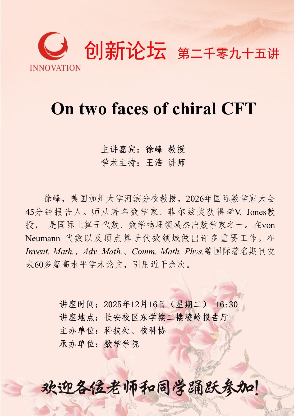 徐峰 教授 古天乐代言太阳集团城网址创新论坛第二千零九十五讲:On two faces of chiral CFT 讲座时间 2025年12月16日(星期二) 16:30 讲座地点 长安校区东学楼二楼凌岭报告厅 讲座人介绍 徐峰 教授 讲座内容