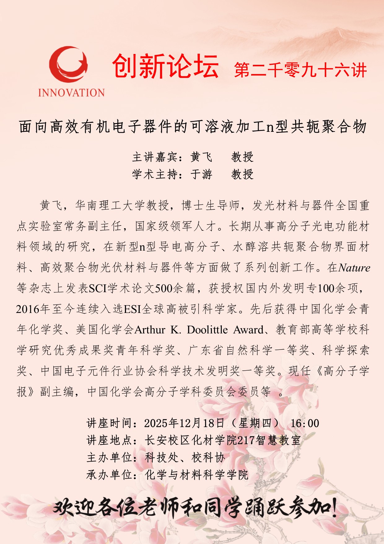 黄飞 教授 古天乐代言太阳集团城网址创新论坛第二千零九十六讲:面向高效有机电子器件的可溶液加工n型共轭聚合物 讲座时间 2025年12月18日(星期四) 16:00 讲座地点 长安校区化材学院217智慧教室 讲座人介绍 黄飞 教授 讲座内容