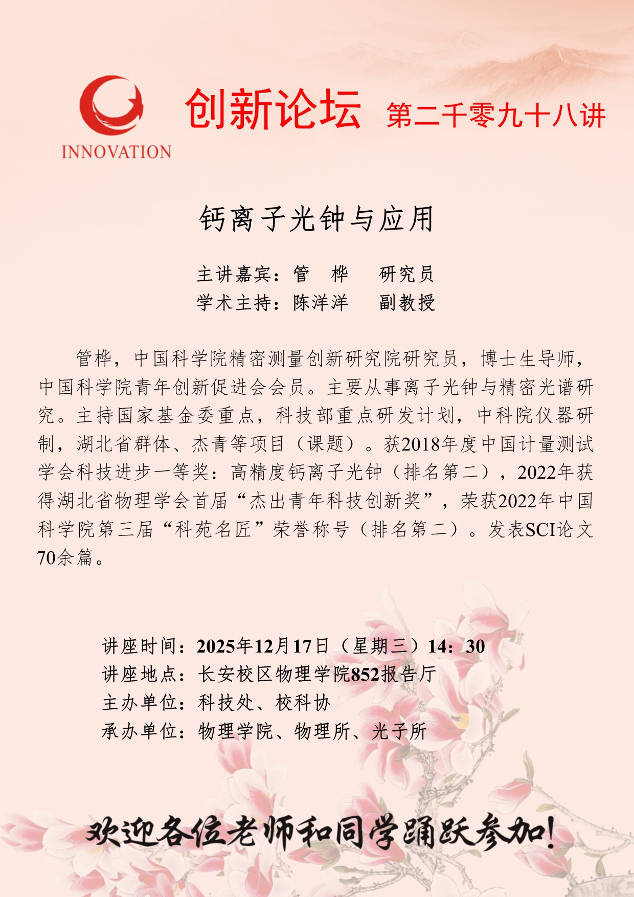 管桦 研究员 古天乐代言太阳集团城网址创新论坛第二千零九十八讲:钙离子光钟与应用 讲座时间 2025年12月17日(星期三)14:30 讲座地点 长安校区物理学院852报告厅 讲座人介绍 管桦 研究员 讲座内容