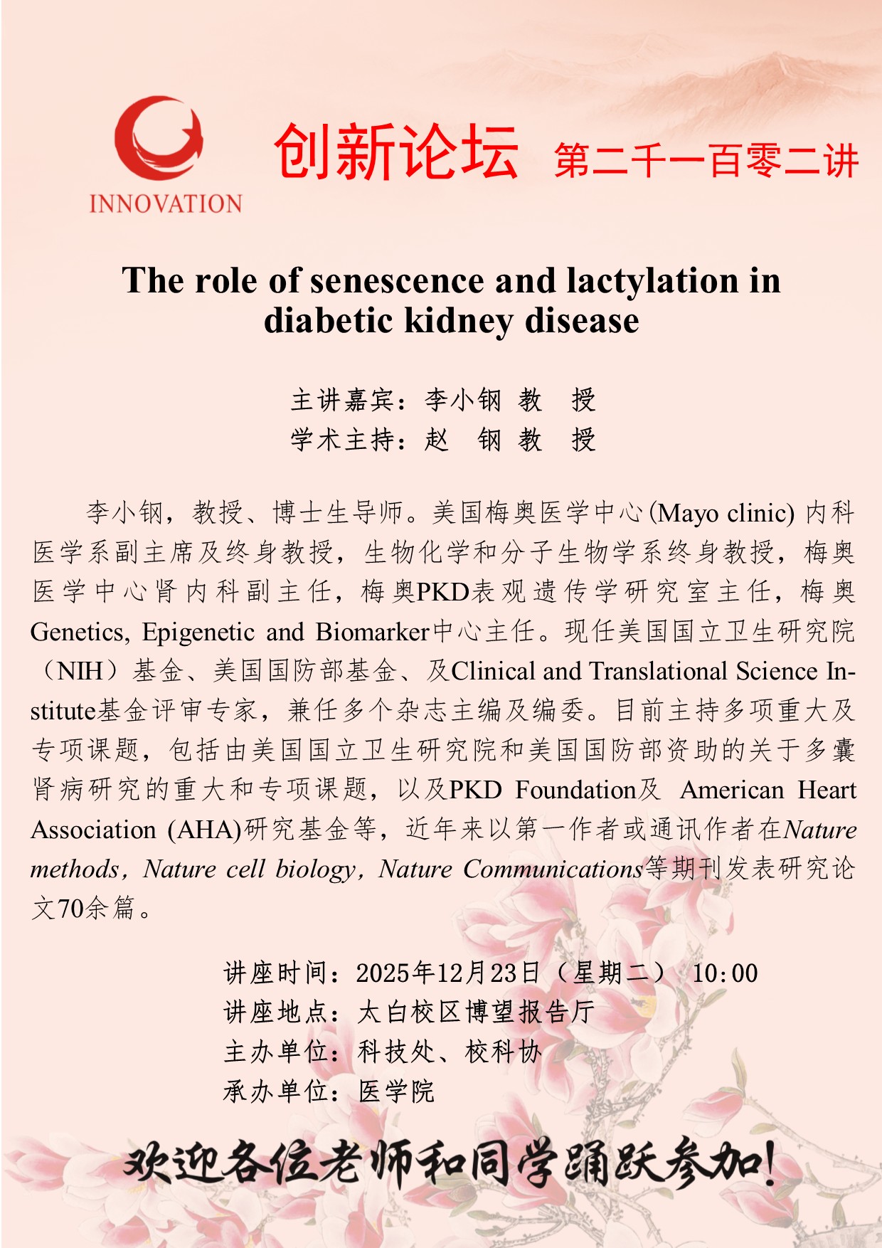 李小钢 教授 古天乐代言太阳集团城网址创新论坛第两千一百零二讲:The role of senescence and lactylation in diabetic kidney disease 讲座时间 2025年12月23日(星期二) 10:00 讲座地点 太白校区博望报告厅 讲座人介绍 李小钢 教授 讲座内容