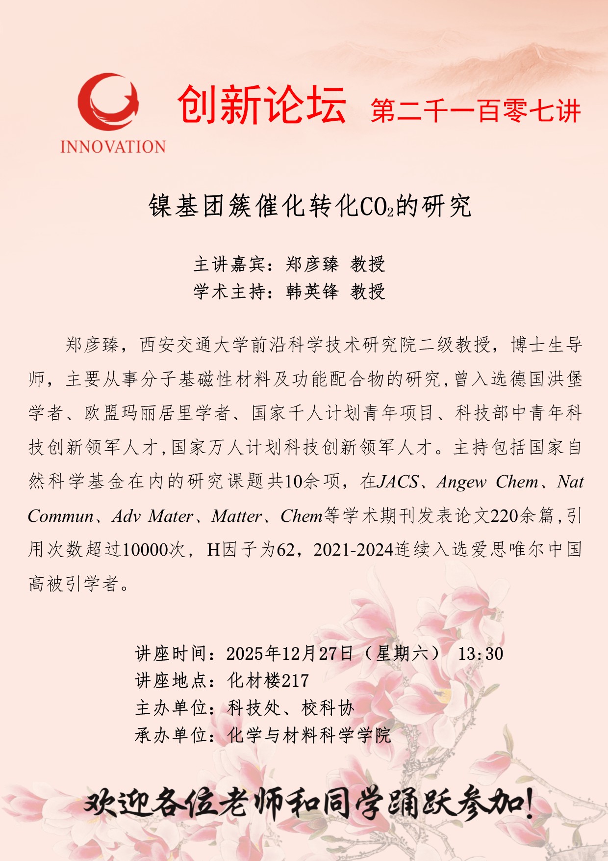 郑彦臻 教授 古天乐代言太阳集团城网址创新论坛第二千一百零七讲:镍基团簇催化转化CO2的研究 讲座时间 2025年12月27日(星期六) 13:30 讲座地点 化材楼217 讲座人介绍 郑彦臻 教授 讲座内容