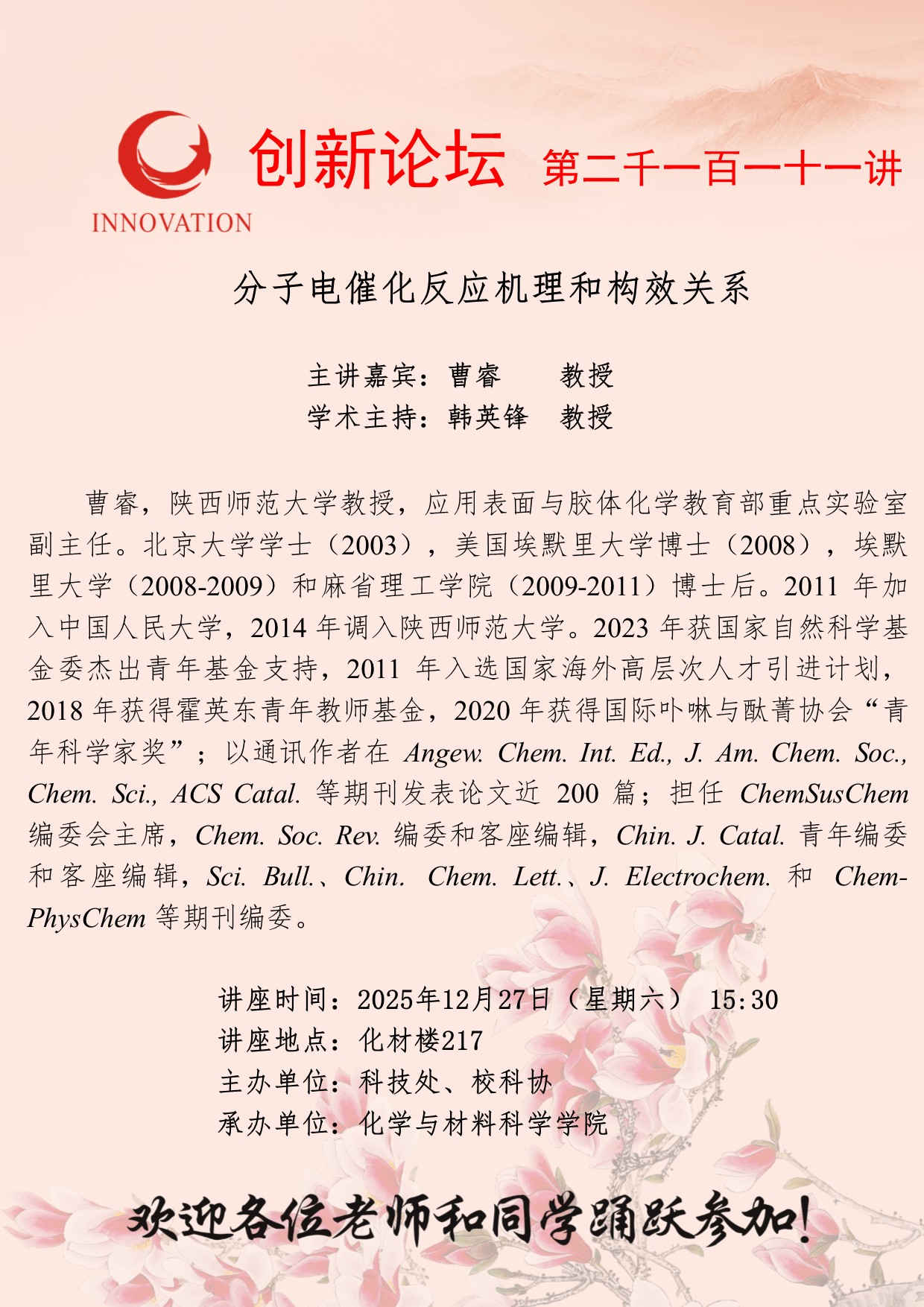 曹睿 教授 古天乐代言太阳集团城网址创新论坛第二千一百一十一讲:分子电催化反应机理和构效关系 讲座时间 2025年12月27日(星期六) 15:30 讲座地点 化材楼217 讲座人介绍 曹睿 教授 讲座内容