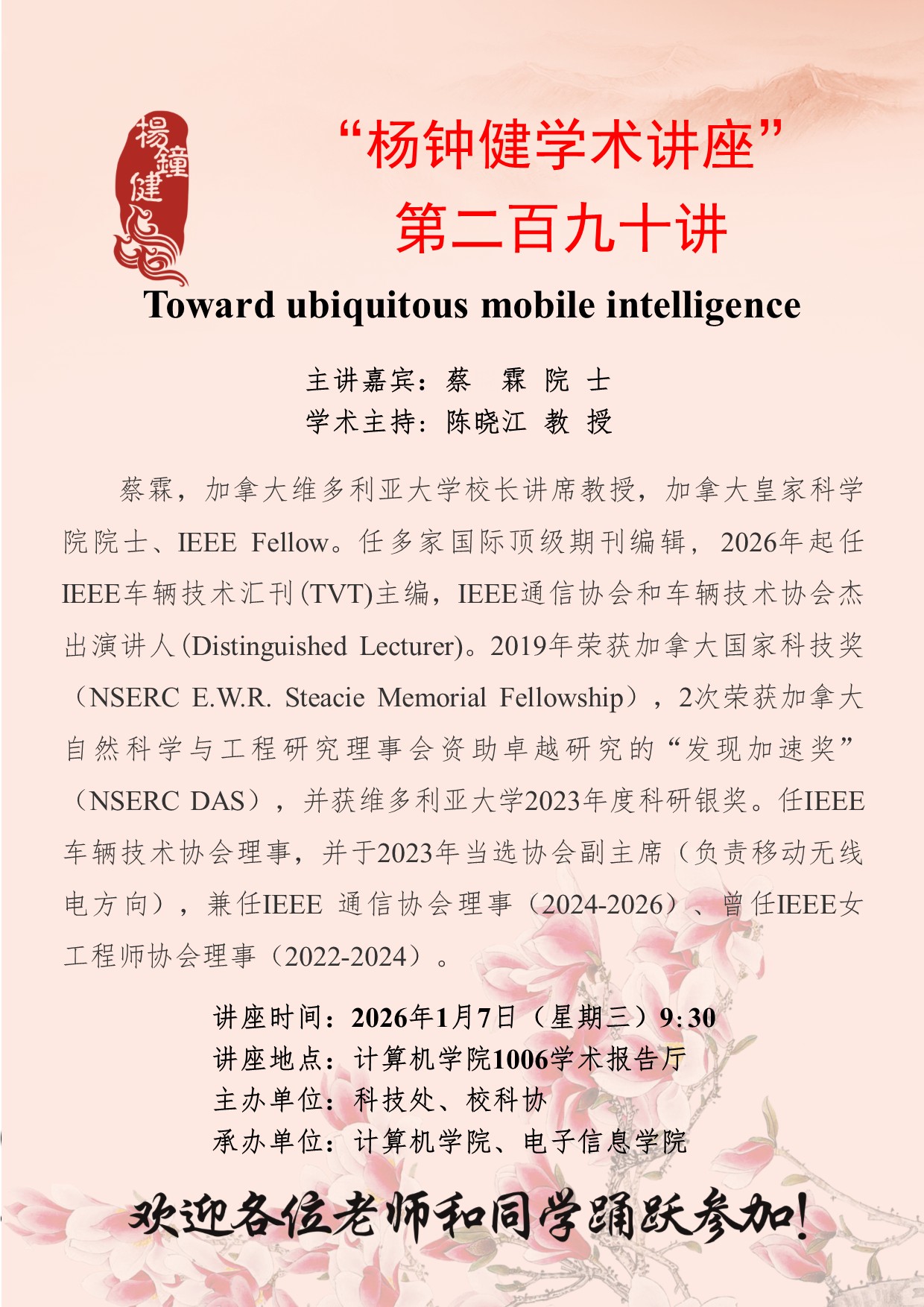 蔡霖 院士 “杨钟健学术讲座”第二百九十讲:Toward ubiquitous mobile intelligence 讲座时间 2026年1月7日(星期三)9:30 讲座地点 计算机学院1006学术报告厅 讲座人介绍 蔡霖 院士 讲座内容