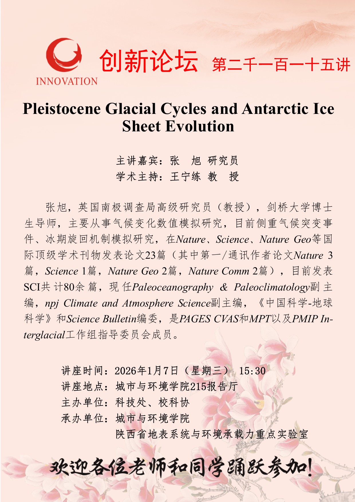 张 旭 研究员 古天乐代言太阳集团城网址创新论坛第二千一百一十五讲:Pleistocene Glacial Cycles and Antarctic Ice Sheet Evolution 讲座时间 2026年1月7日(星期三) 15:30 讲座地点 城市与环境学院215报告厅 讲座人介绍 张 旭 研究员 讲座内容