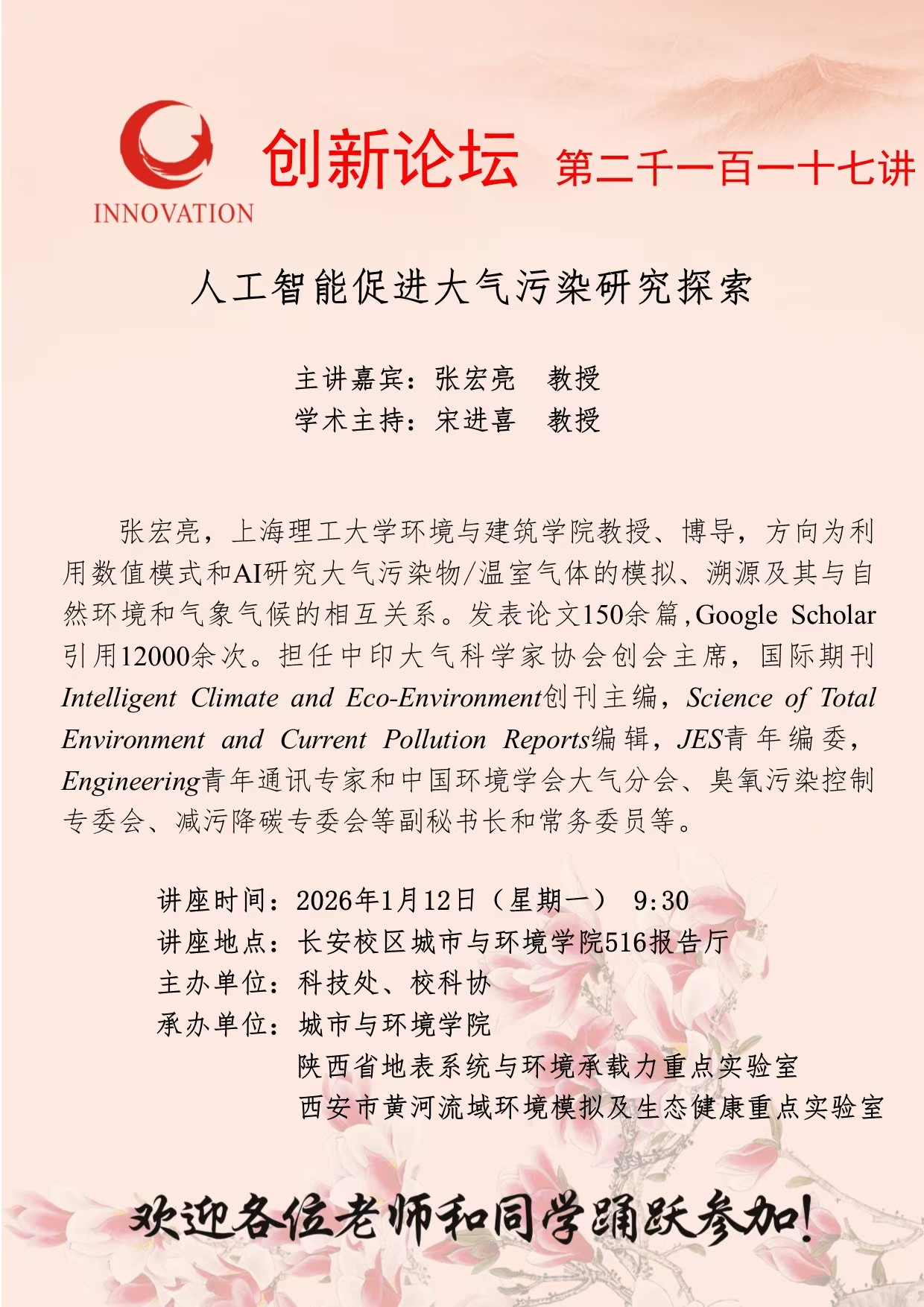 张宏亮 教授 古天乐代言太阳集团城网址创新论坛第二千一百一十七讲:人工智能促进大气污染研究探索 讲座时间 2026年1月12日(星期一) 9:30 讲座地点 长安校区城市与环境学院516报告厅 讲座人介绍 张宏亮 教授 讲座内容