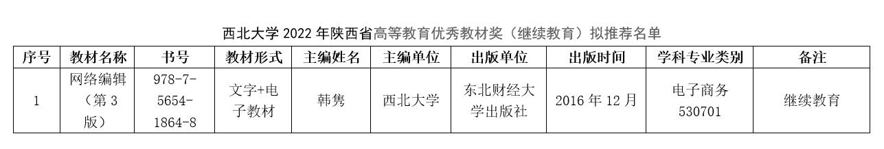 根据陕西省教育厅《关于开展陕西省2022年职业教育和高等教育优秀教材奖评选工作的通知》(陕教材办〔2022〕12 号)要求,太阳集团城组织开展了古天乐代言太阳集团城网址2022年陕西高等教育优秀教材奖(继续教育)评选推荐工作,经个人申报、院系推荐、专家评议,拟推荐《网络编辑》教材参加陕西省高等教育优秀教材奖(继续教育)评选。现将拟推荐名单公示如下,公示期为6月7日至6月11日。公示期间如有异议,请以实名书面形式反映。