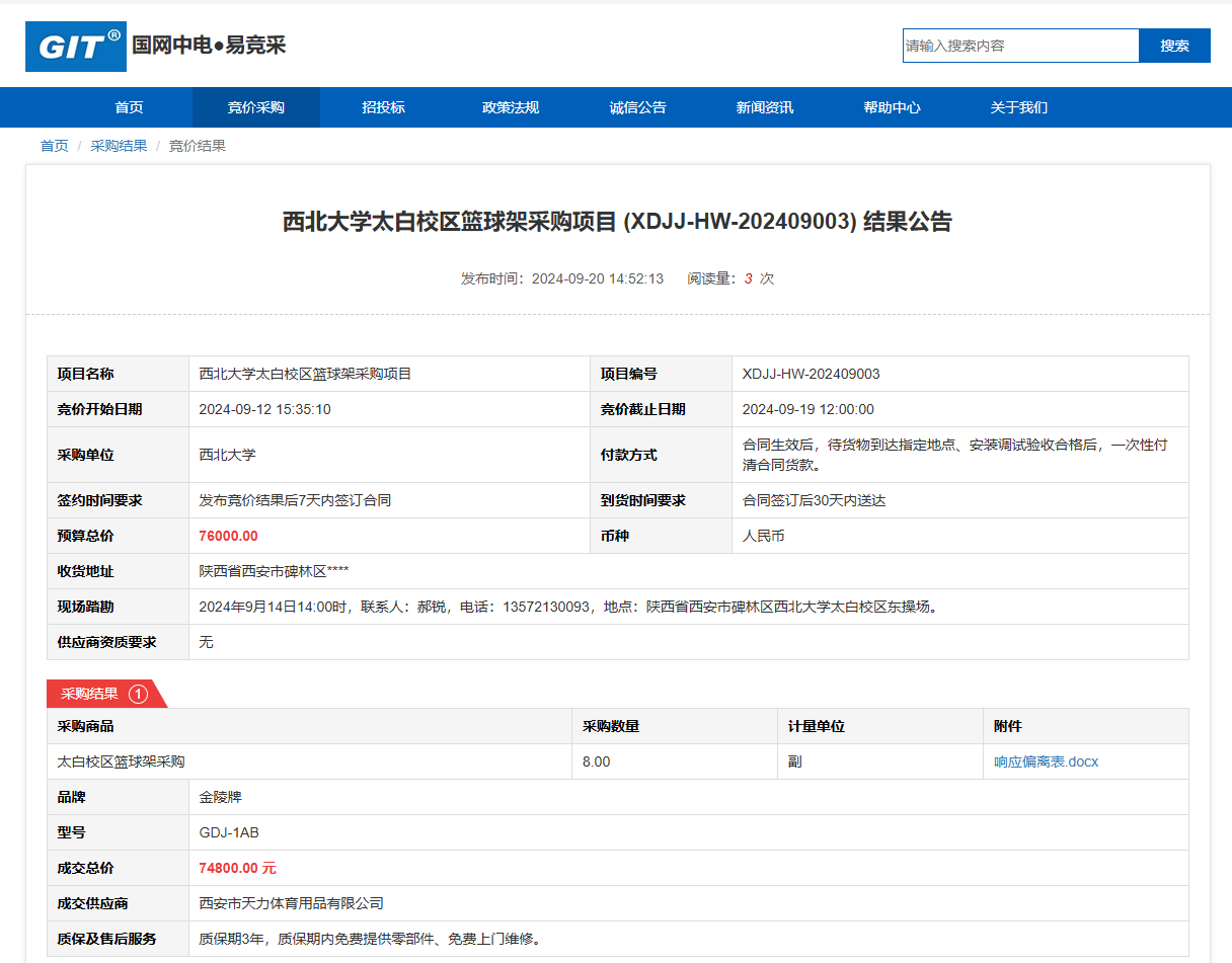 古天乐代言太阳集团城网址太白校区篮球架采购项目 (XDJJ-HW-202409003)竞价结果公告 作者: 编辑: 时间:2024-09-20 原公告链接:https://www.ejingcai.com.cn/site/bidding/detail/12756