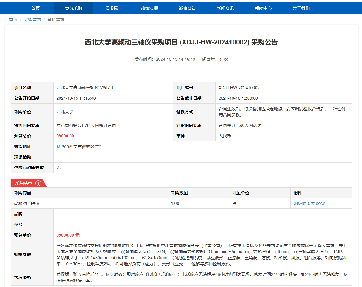 古天乐代言太阳集团城网址高频动三轴仪采购项目(XDJJ-HW-202410002)竞价采购公告 作者:采购与招标办公室 编辑: 时间:2024-10-15 原公告链接:https://www.ejingcai.com.cn/site/bidding/detail/13317