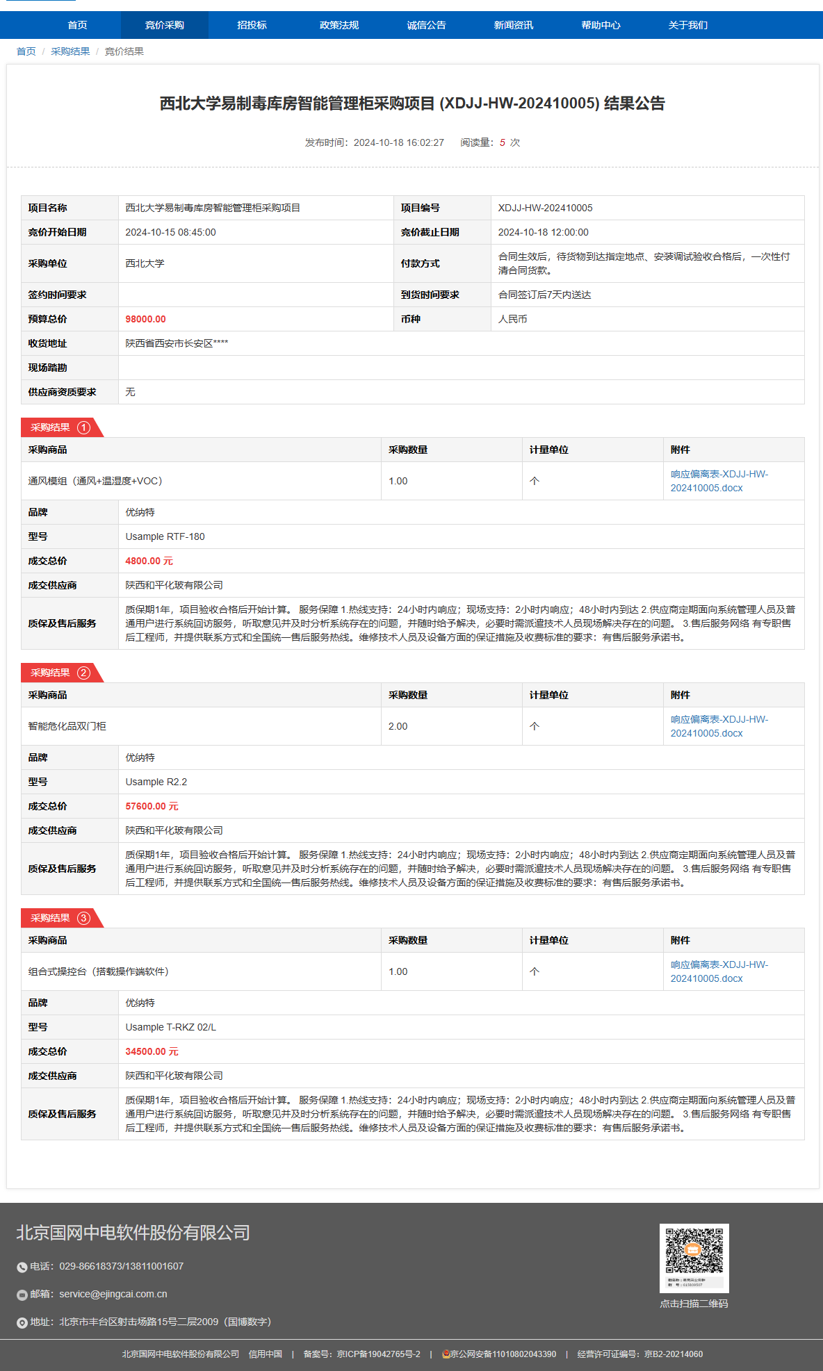 古天乐代言太阳集团城网址易制毒库房智能管理柜采购项目(XDJJ-HW-202410005)竞价结果公告 作者:采购与招标办公室 编辑: 时间:2024-10-18 原公告链接:https://www.ejingcai.com.cn/site/bidding/detail/13487