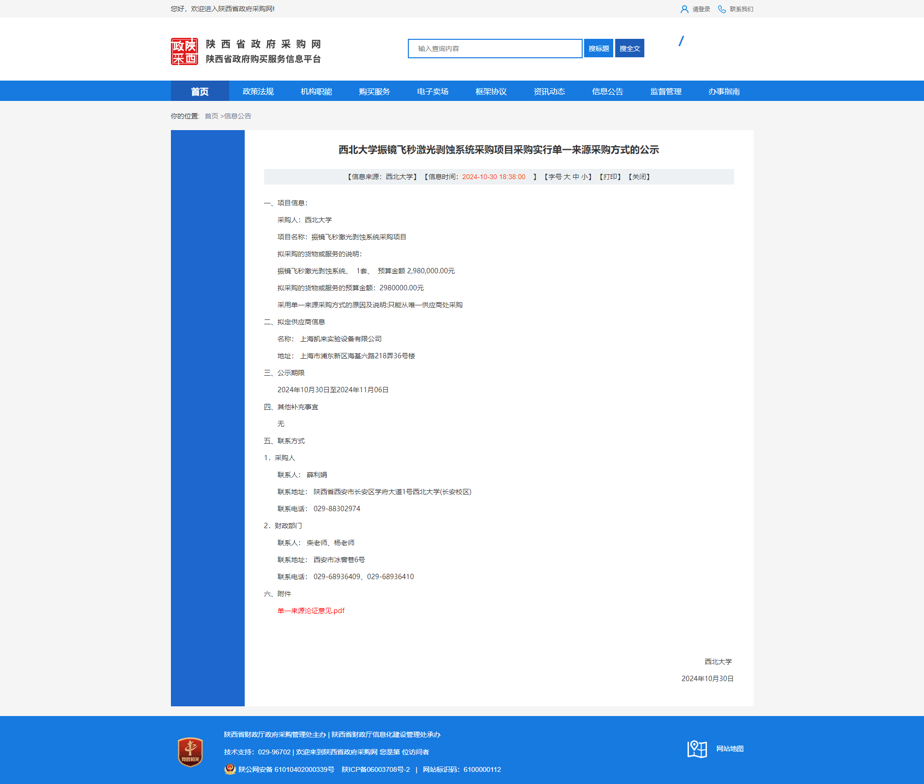 古天乐代言太阳集团城网址振镜飞秒激光剥蚀系统采购项目采购实行单一来源采购方式的公示