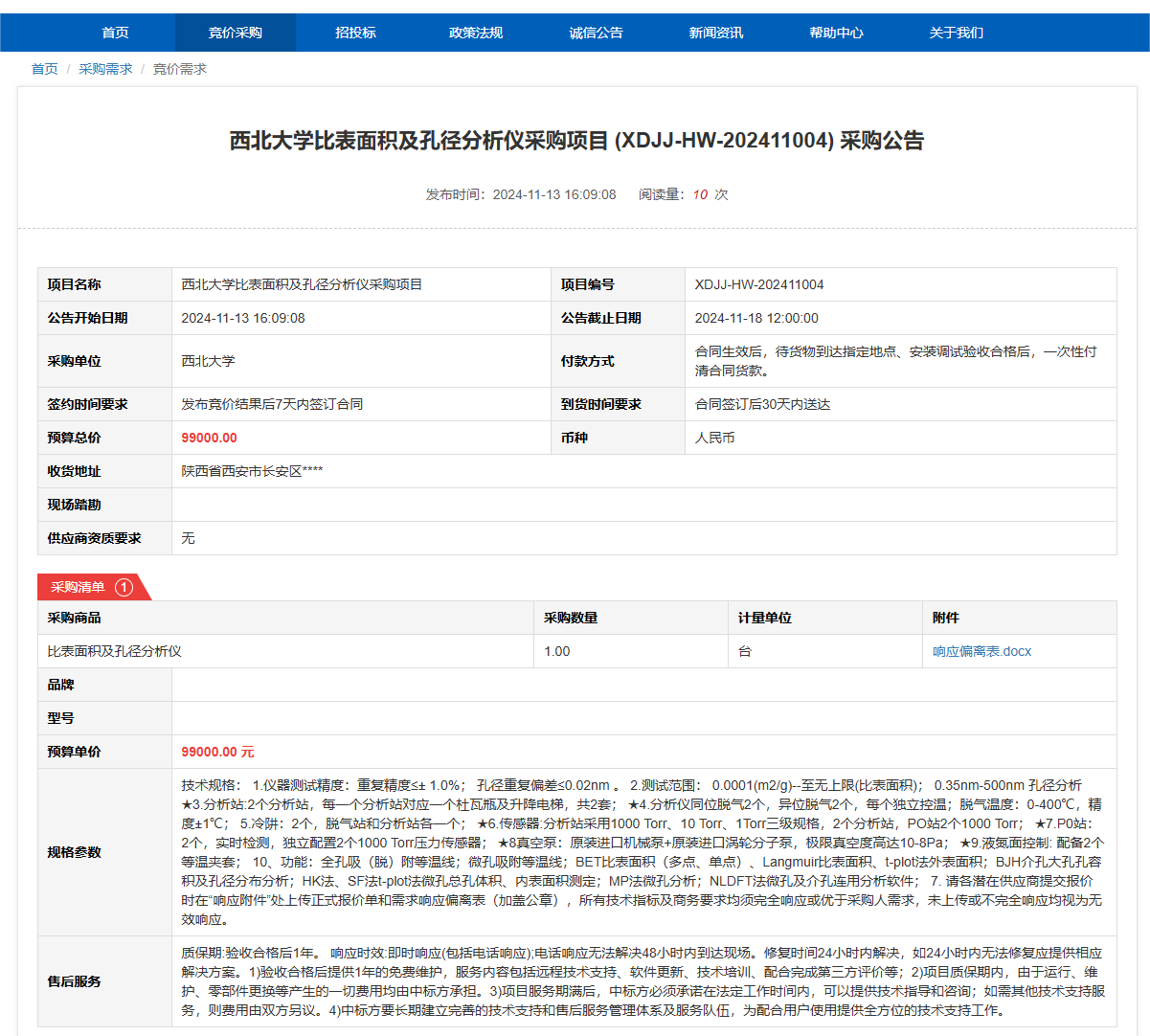 古天乐代言太阳集团城网址比表面积及孔径分析仪采购项目(XDJJ-HW-202411004)竞价采购公告 作者:采购与招标办公室 编辑: 时间:2024-11-13 原公告链接:https://www.ejingcai.com.cn/site/bidding/detail/14819