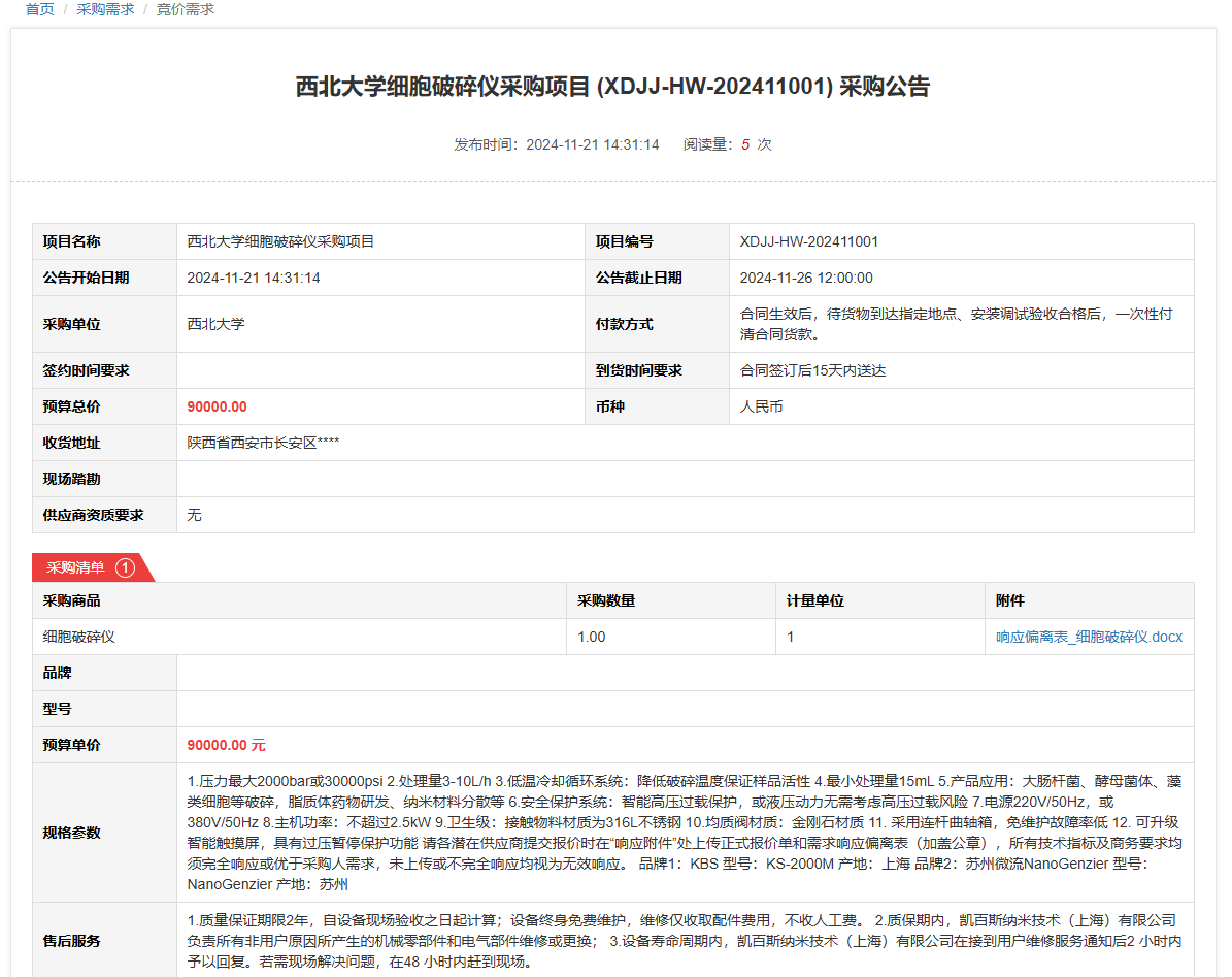 古天乐代言太阳集团城网址细胞破碎仪采购项目(XDJJ-HW-202411001)竞价采购公告 作者:采购与招标办公室 编辑: 时间:2024-11-21 原公告链接:https://www.ejingcai.com.cn/site/bidding/detail/15200