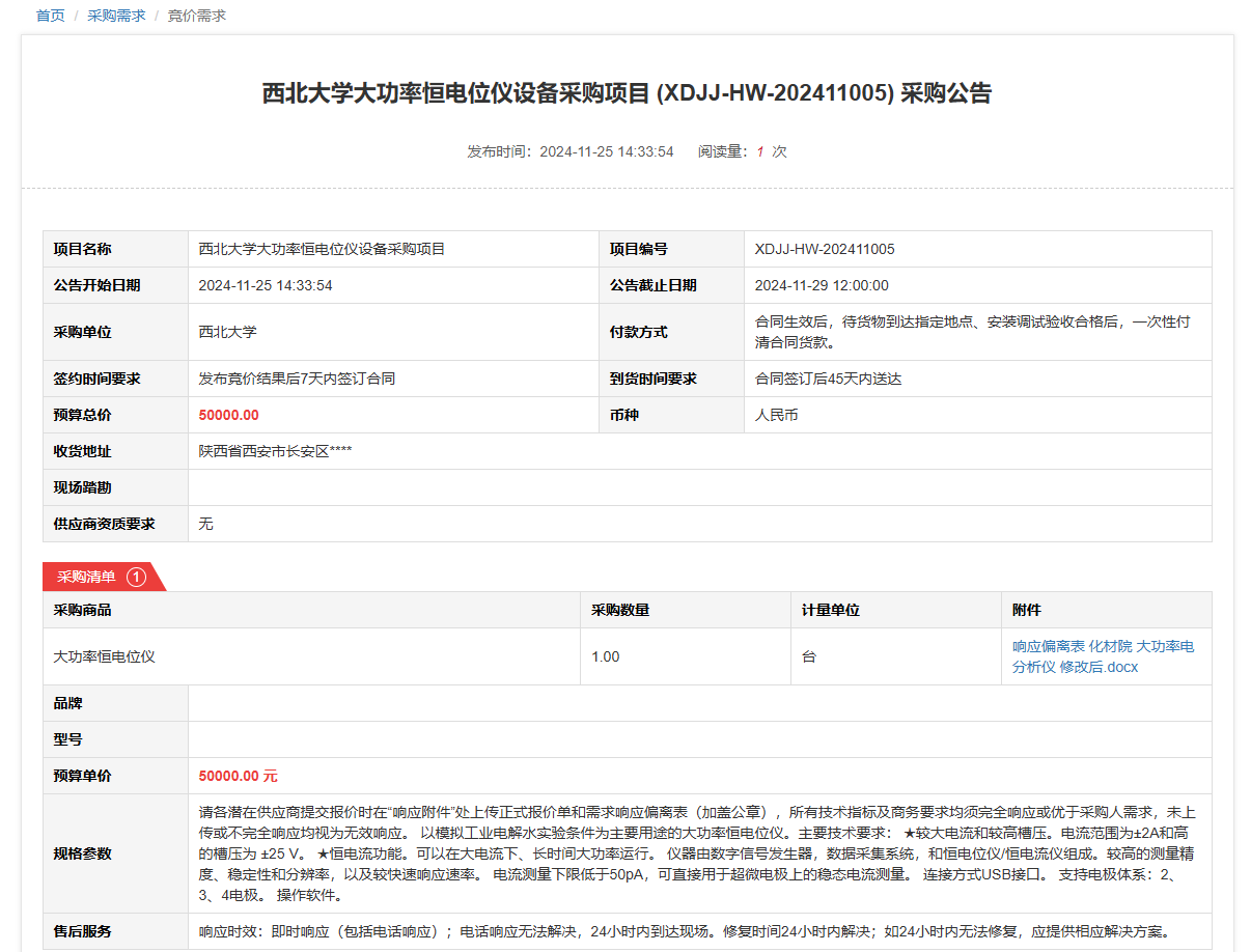 古天乐代言太阳集团城网址大功率恒电位仪设备采购项目(XDJJ-HW-202411005)竞价采购公告 作者:采购与招标办公室 编辑: 时间:2024-11-25 原公告链接:https://www.ejingcai.com.cn/site/bidding/detail/15327