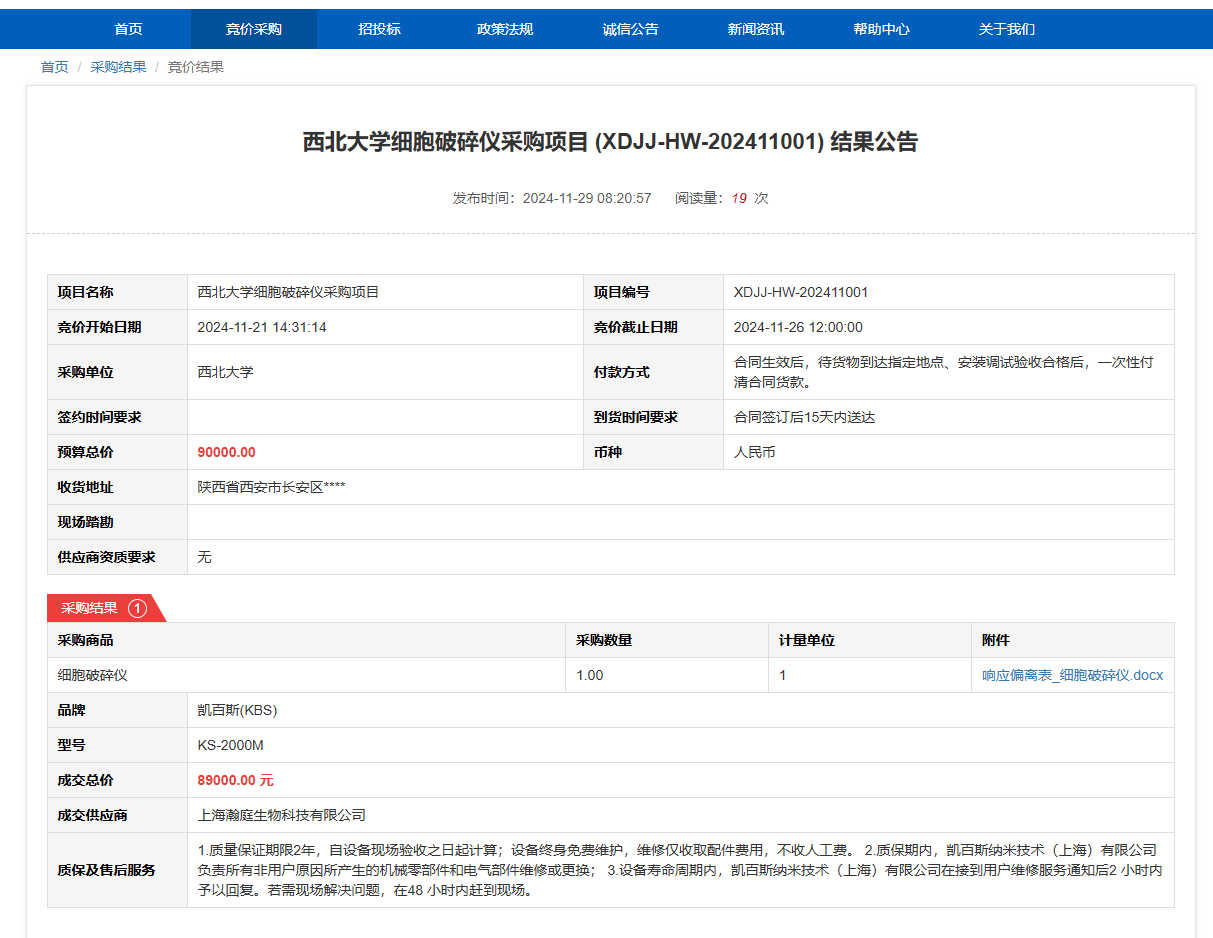 古天乐代言太阳集团城网址细胞破碎仪采购项目(XDJJ-HW-202411001)竞价结果公告 作者:采购与招标办公室 编辑: 时间:2024-11-29 原公告链接:https://www.ejingcai.com.cn/site/bidding/detail/15477