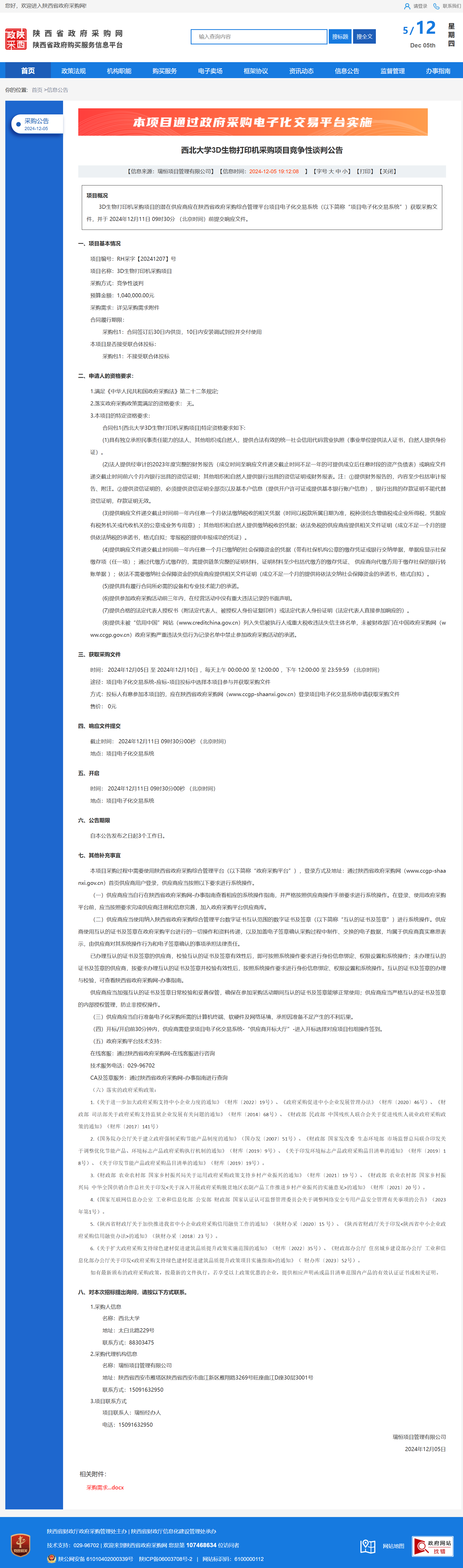 古天乐代言太阳集团城网址3D生物打印机采购项目竞争性谈判公告 作者:采购与招标办公室 编辑: 时间:2024-12-05 原公告链接:http://www.ccgp-shaanxi.gov.cn/freecms/site/shaanxi/ggxx/info/2024/8a69c95d921859f001939679368a3d50.html?noticeType=001013¬iceId=5fb3a087-b2fb-11ef-8063-08c0eb20c666
