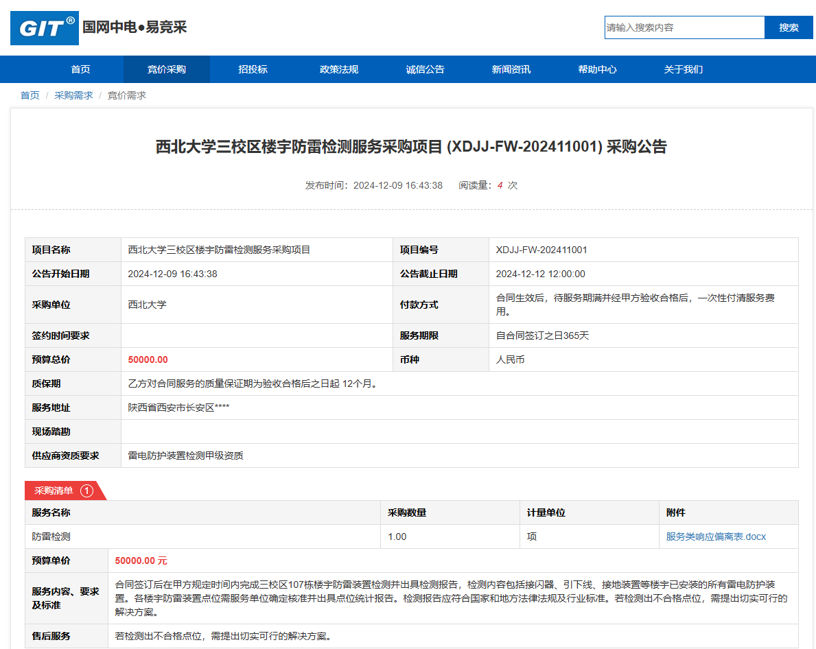 古天乐代言太阳集团城网址三校区楼宇防雷检测服务采购项目(XDJJ-FW-202411001)采购公告 作者:采购与招标办公室 编辑: 时间:2024-12-09 原公告链接:https://www.ejingcai.com.cn/site/bidding/detail/15824