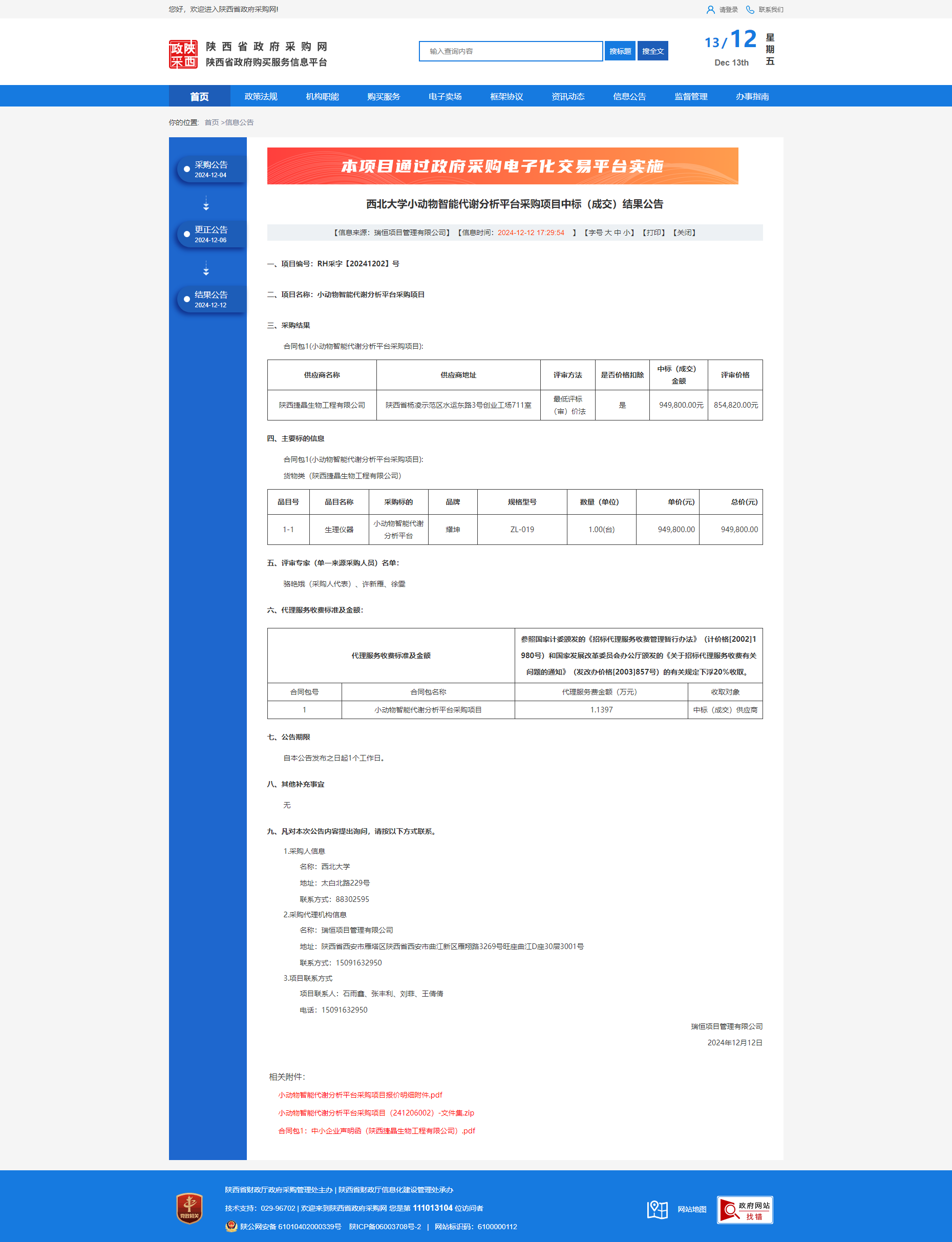 古天乐代言太阳集团城网址小动物智能代谢分析平台采购项目中标(成交)结果公告