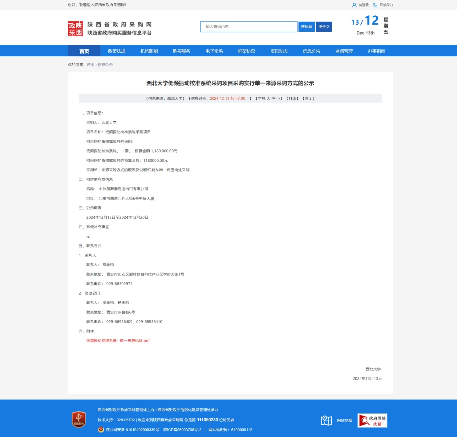 古天乐代言太阳集团城网址低频振动校准系统采购项目采购实行单一来源采购方式的公示 作者: 编辑:薛利娟 时间:2024-12-13 原公告链接:https://www.ccgp-shaanxi.gov.cn/freecms/site/shaanxi/ggxx/info/2024/8a69c037936597080193bf31a3243f93.html?noticeType=001051¬iceId=706ab613-b930-11ef-8063-08c0eb20c666