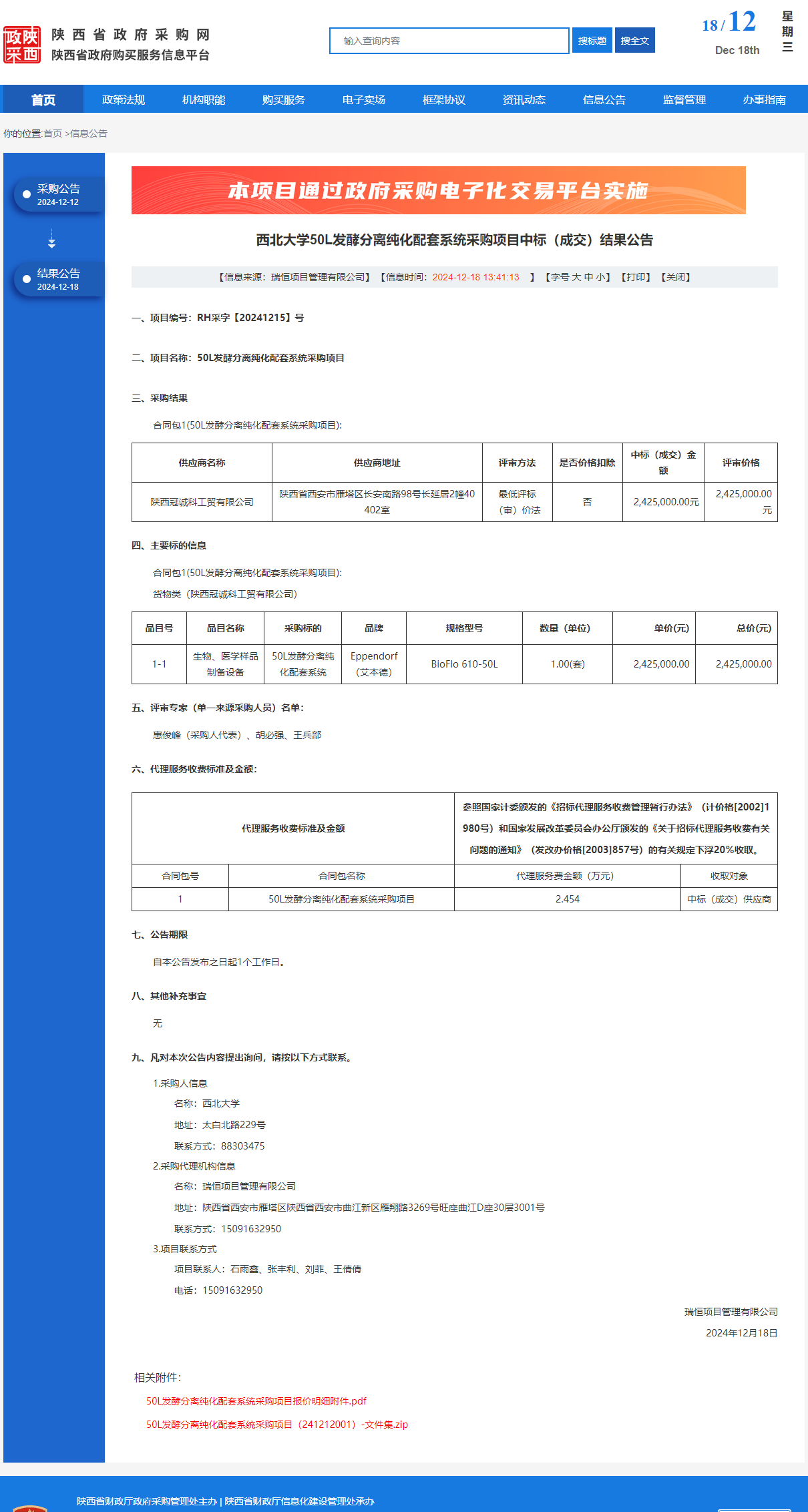 古天乐代言太阳集团城网址50L发酵分离纯化配套系统采购项目中标(成交)结果公告 作者:采购与招标办公室 编辑: 时间:2024-12-18 原公告链接:https://www.ccgp-shaanxi.gov.cn/freecms/site/shaanxi/ggxx/info/2024/8a69c5a59218576d0193d83e10003654.html
