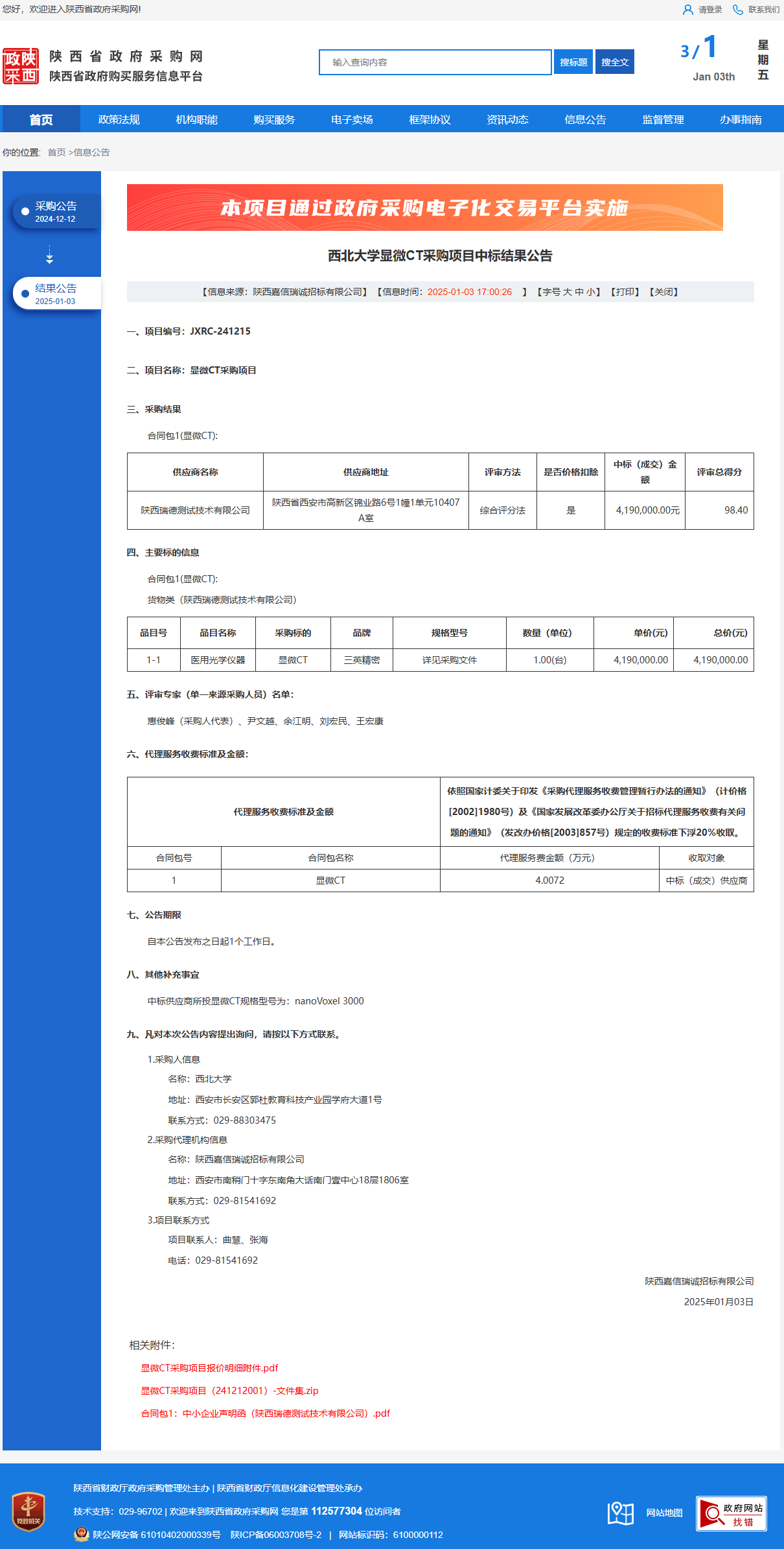 古天乐代言太阳集团城网址显微CT采购项目中标结果公告 作者:采购与招标办公室 编辑: 时间:2025-01-03 原公告链接:https://www.ccgp-shaanxi.gov.cn/freecms/site/shaanxi/ggxx/info/2025/8a69c44e9218572b01942b1fbacb63ce.html?noticeType=001021¬iceId=d5b3fb7e-c9b2-11ef-8063-08c0eb20c666