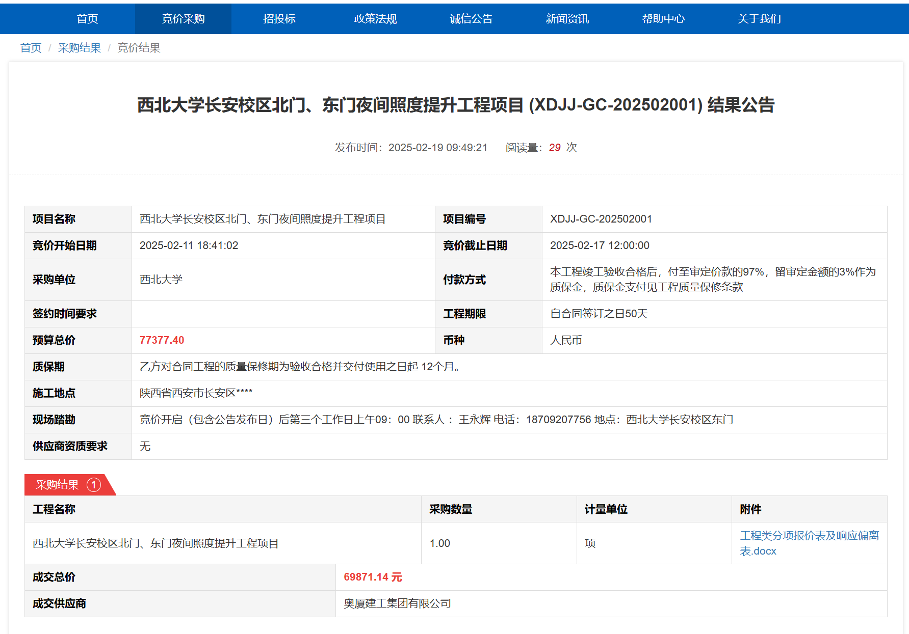 古天乐代言太阳集团城网址长安校区北门、东门夜间照度提升工程项目(XDJJ-GC-202502001)竞价结果公告 作者:采购与招标办公室 编辑: 时间:2025-02-19 原公告链接:https://www.ejingcai.com.cn/site/bidding/detail/16553