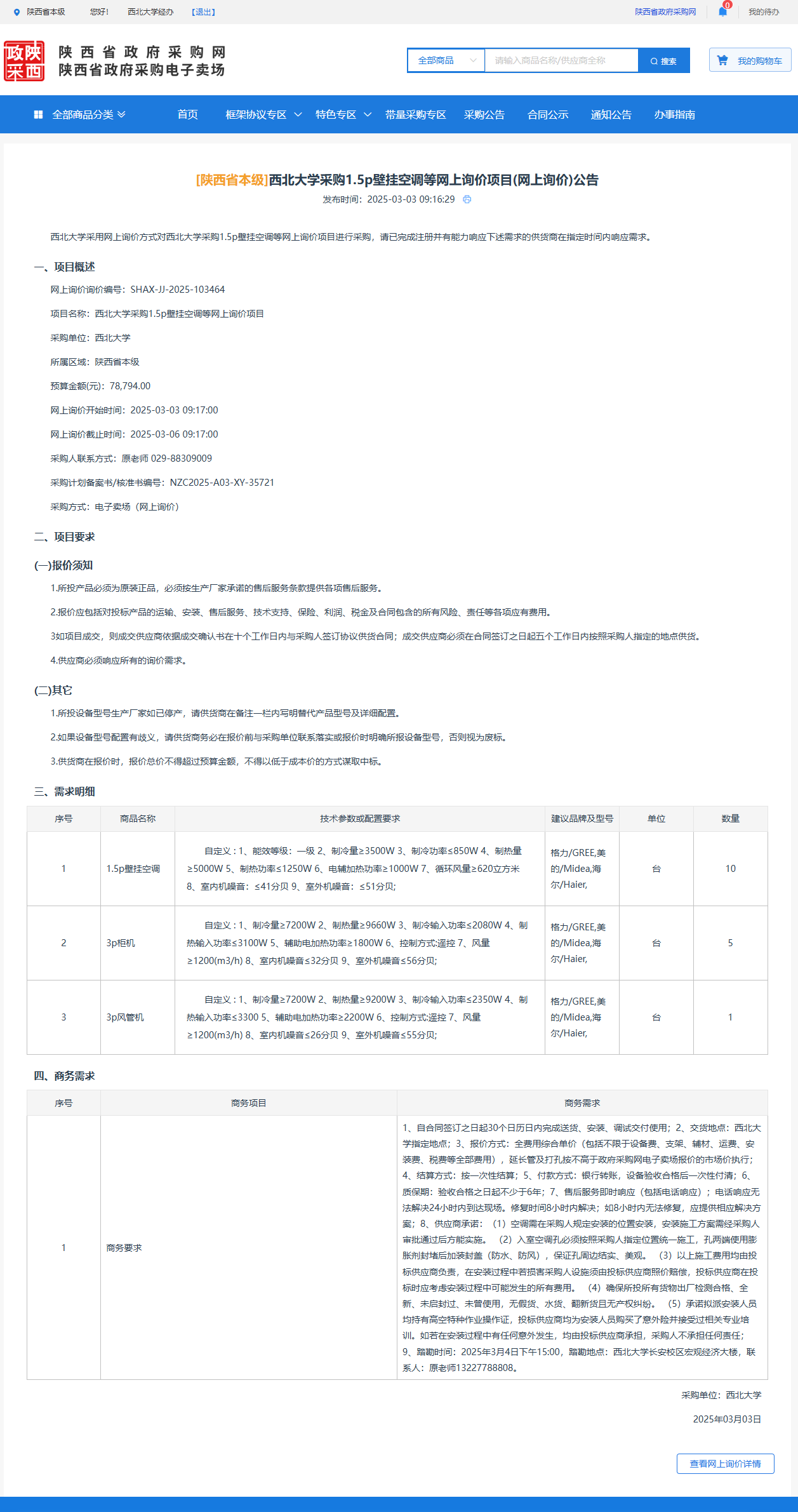 古天乐代言太阳集团城网址采购1.5p壁挂空调等网上询价项目(网上询价)公告 作者:采购与招标办公室 编辑: 时间:2025-03-03 原公告链接:https://www.ccgp-shaanxi.gov.cn/gpmall-main-web/basic/noticeDetail?noticeGuid=7295516810999431168