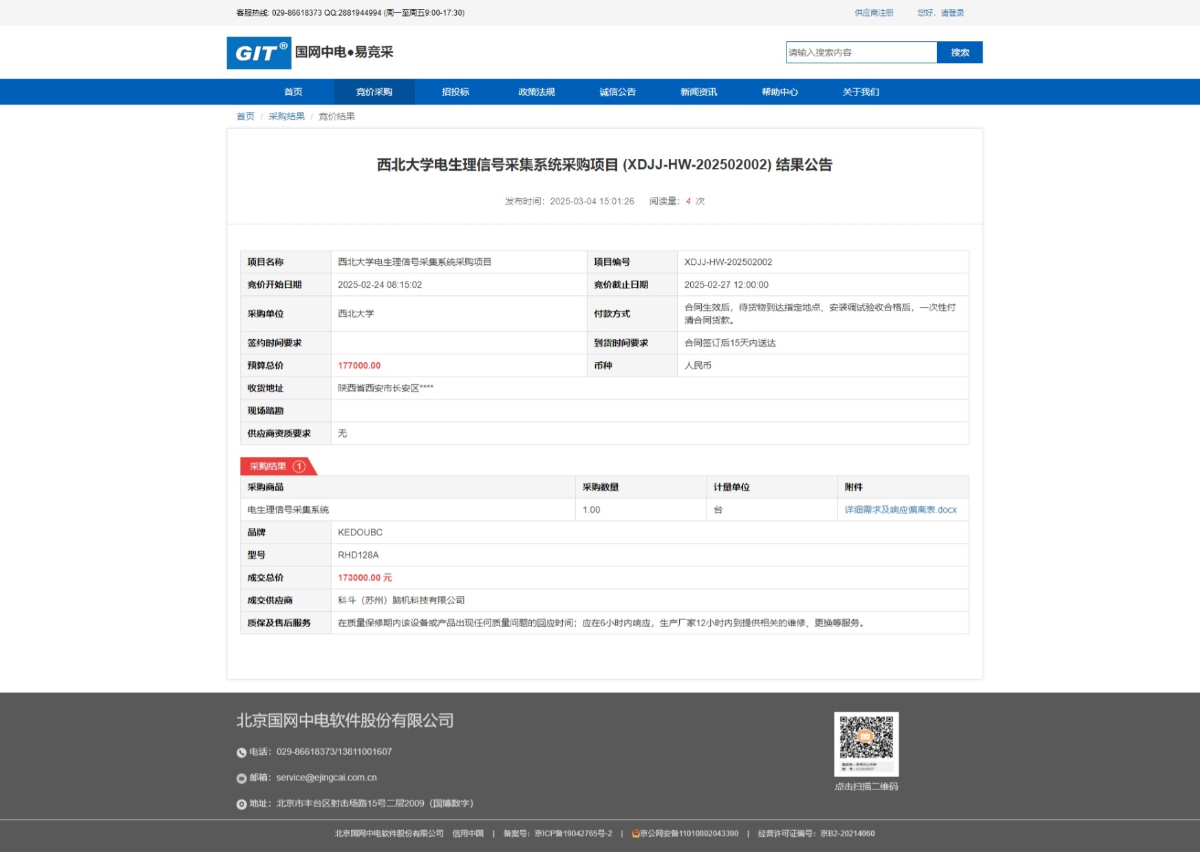 古天乐代言太阳集团城网址电生理信号采集系统采购项目 (XDJJ-HW-202502002) 竞价结果公告 作者: 编辑:采购与招标办公室 时间:2025-03-04 原公告链接:https://www.ejingcai.com.cn/site/bidding/detail/16713