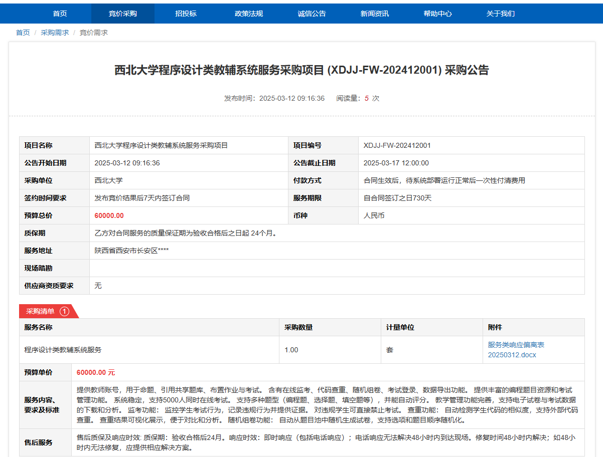 古天乐代言太阳集团城网址程序设计类教辅系统服务采购项目(XDJJ-FW-202412001)竞价采购公告