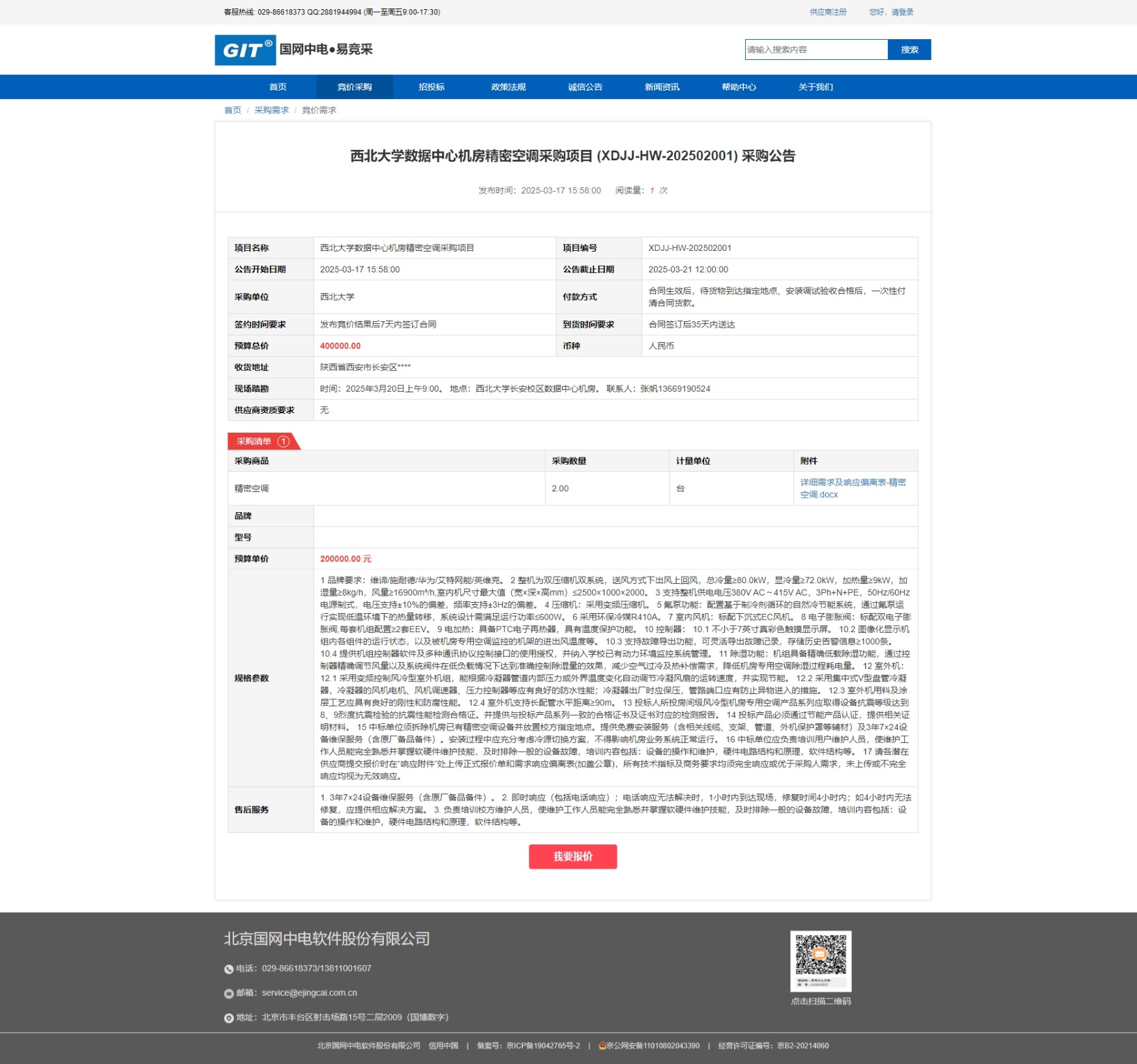 古天乐代言太阳集团城网址数据中心机房精密空调采购项目 (XDJJ-HW-202502001)网上竞价采购公告