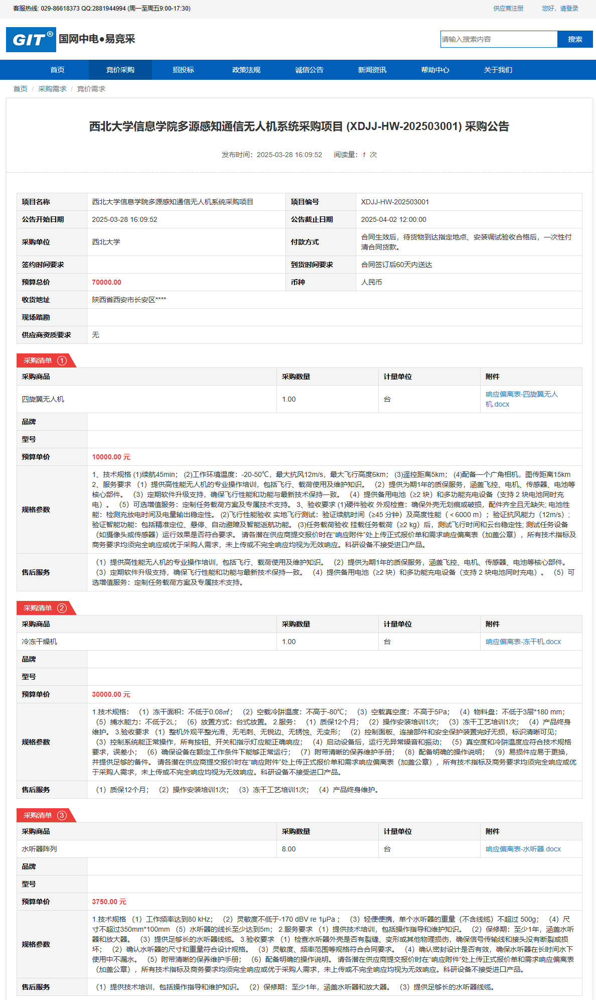 古天乐代言太阳集团城网址信息学院多源感知通信无人机系统采购项目(XDJJ-HW-202503001)竞价采购公告 作者:采购与招标办公室 编辑: 时间:2025-03-28 原公告链接:https://www.ejingcai.com.cn/site/bidding/detail/17255