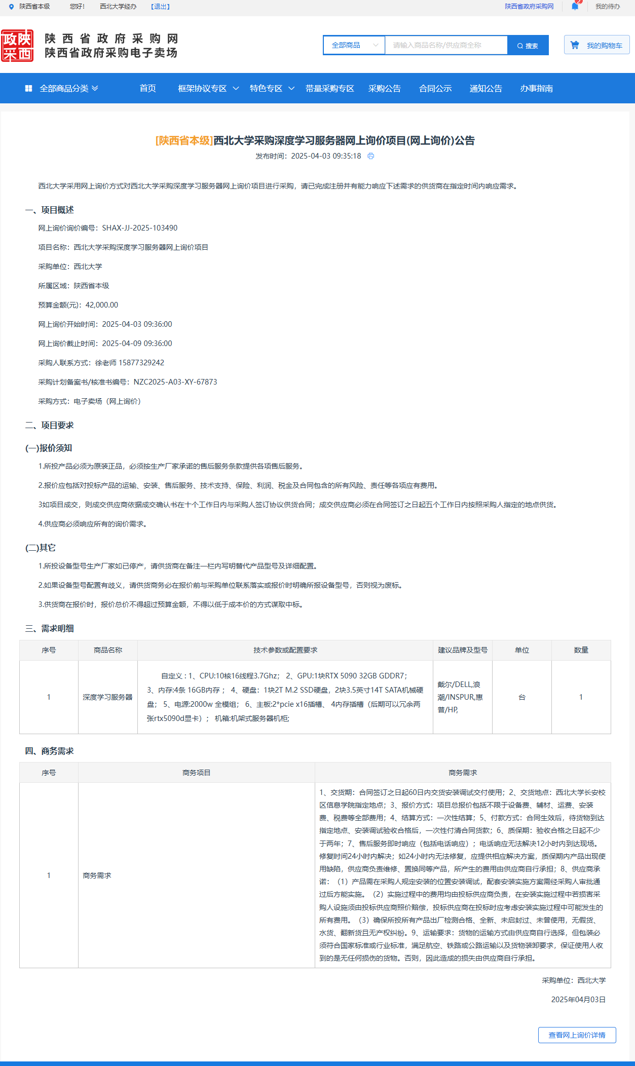 古天乐代言太阳集团城网址采购深度学习服务器网上询价项目(网上询价)公告 作者:采购与招标办公室 编辑: 时间:2025-04-03 原公告链接:https://www.ccgp-shaanxi.gov.cn/gpmall-main-web/basic/noticeDetail?noticeGuid=7306755570823004160