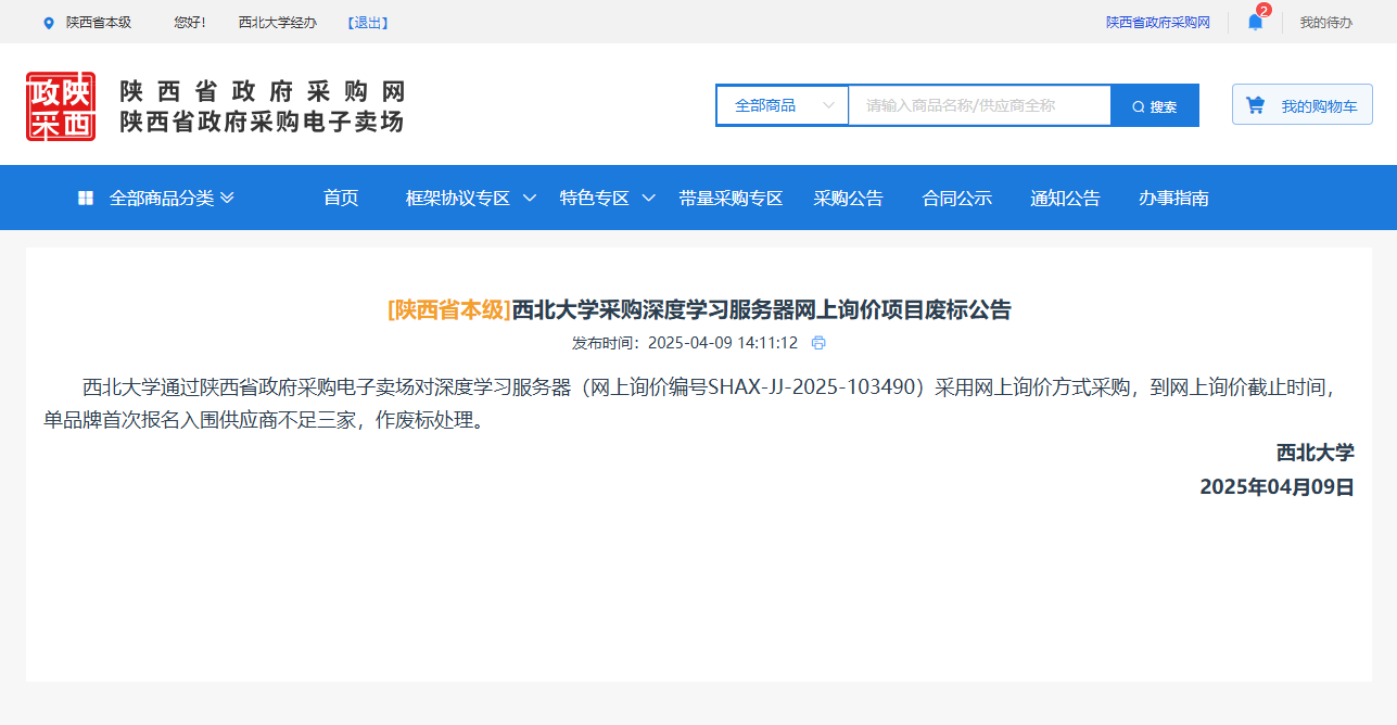古天乐代言太阳集团城网址采购深度学习服务器网上询价项目废标公告 作者:采购与招标办公室 编辑: 时间:2025-04-09 原公告链接:https://www.ccgp-shaanxi.gov.cn/gpmall-main-web/basic/noticeDetail?noticeGuid=7308999329707130880
