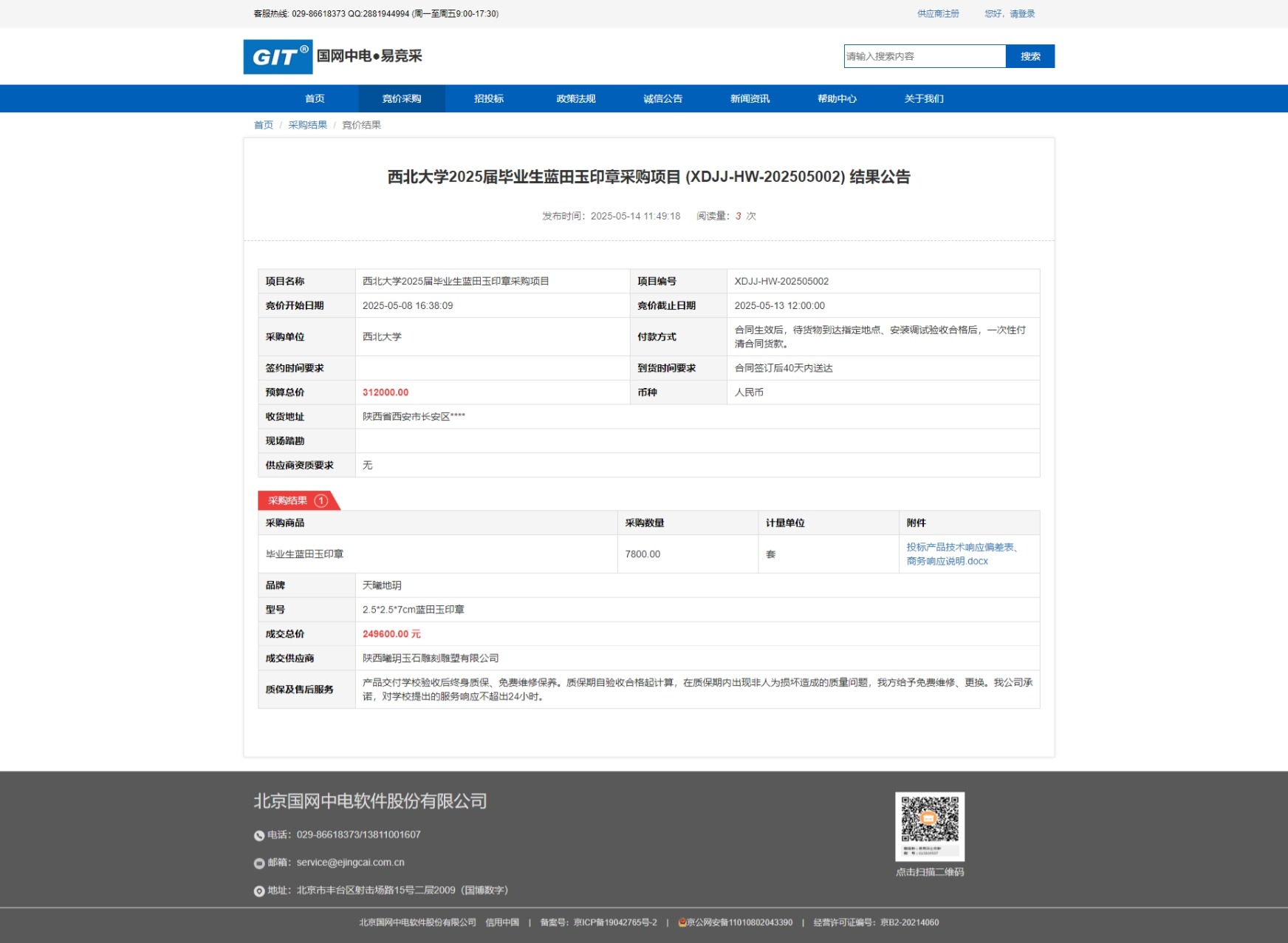 古天乐代言太阳集团城网址2025届毕业生蓝田玉印章采购项目 (XDJJ-HW-202505002) 竞价结果公告 作者: 编辑:采购与招标办公室 时间:2025-05-14 原公告链接:https://www.ejingcai.com.cn/site/bidding/detail/18215