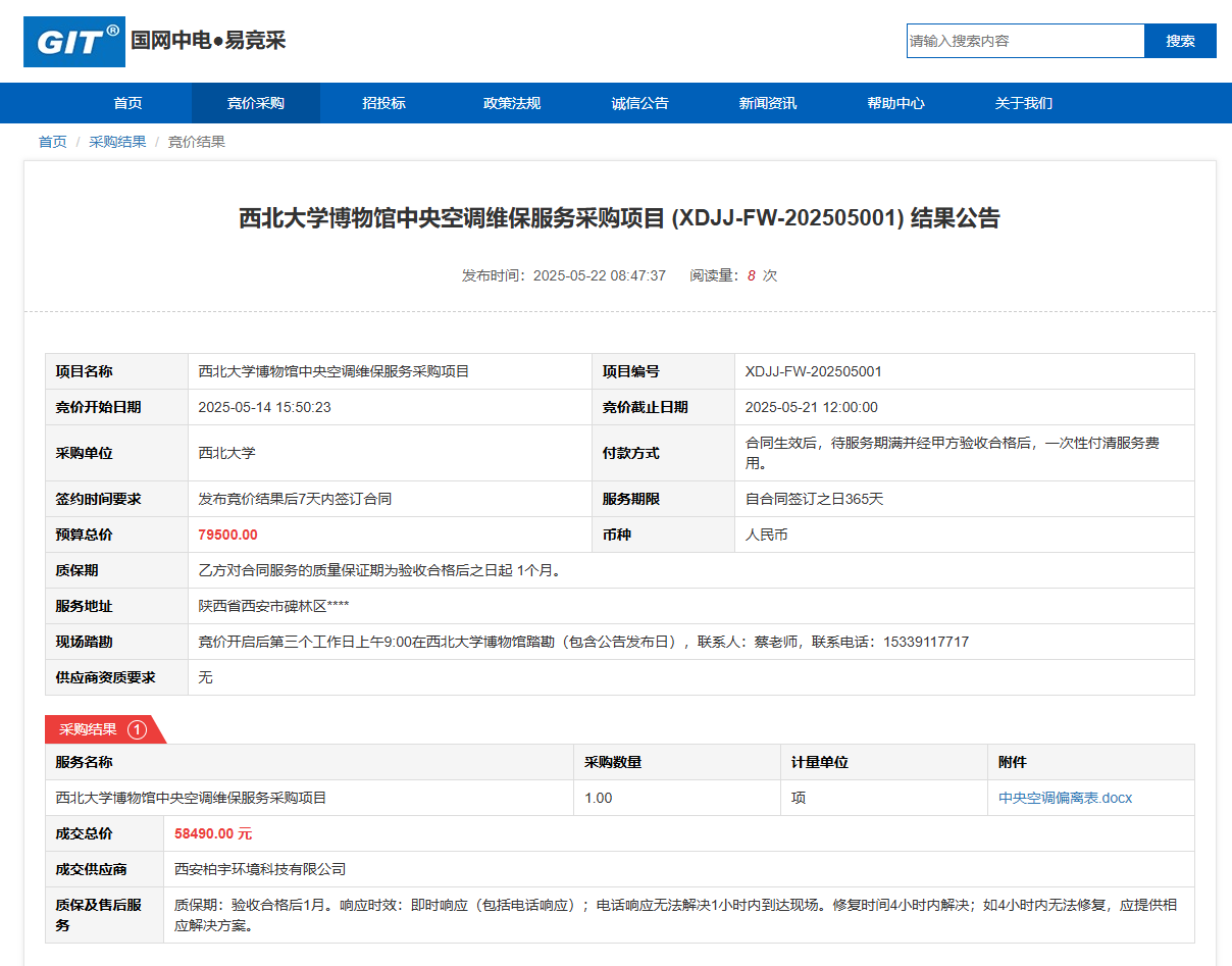 古天乐代言太阳集团城网址博物馆中央空调维保服务采购项目(XDJJ-FW-202505001)竞价结果公告 作者:采购与招标办公室 编辑: 时间:2025-05-22 原公告链接:https://www.ejingcai.com.cn/site/bidding/detail/18384