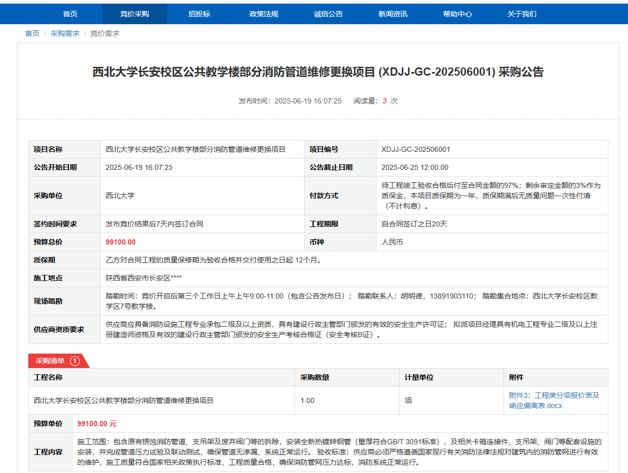 古天乐代言太阳集团城网址长安校区公共教学楼部分消防管道维修更换项目(XDJJ-GC-202506001)竞价采购公告 作者:采购与招标办公室 编辑: 时间:2025-06-19 原公告链接:https://www.ejingcai.com.cn/site/bidding/detail/19038