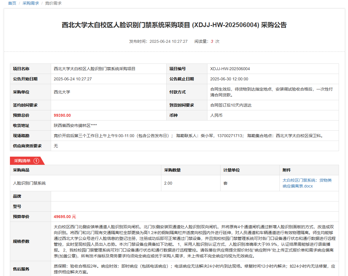 古天乐代言太阳集团城网址太白校区人脸识别门禁系统采购项目(XDJJ-HW-202506004)竞价采购公告 作者: 编辑: 时间:2025-06-24 原公告链接:https://www.ejingcai.com.cn/site/bidding/detail/19128