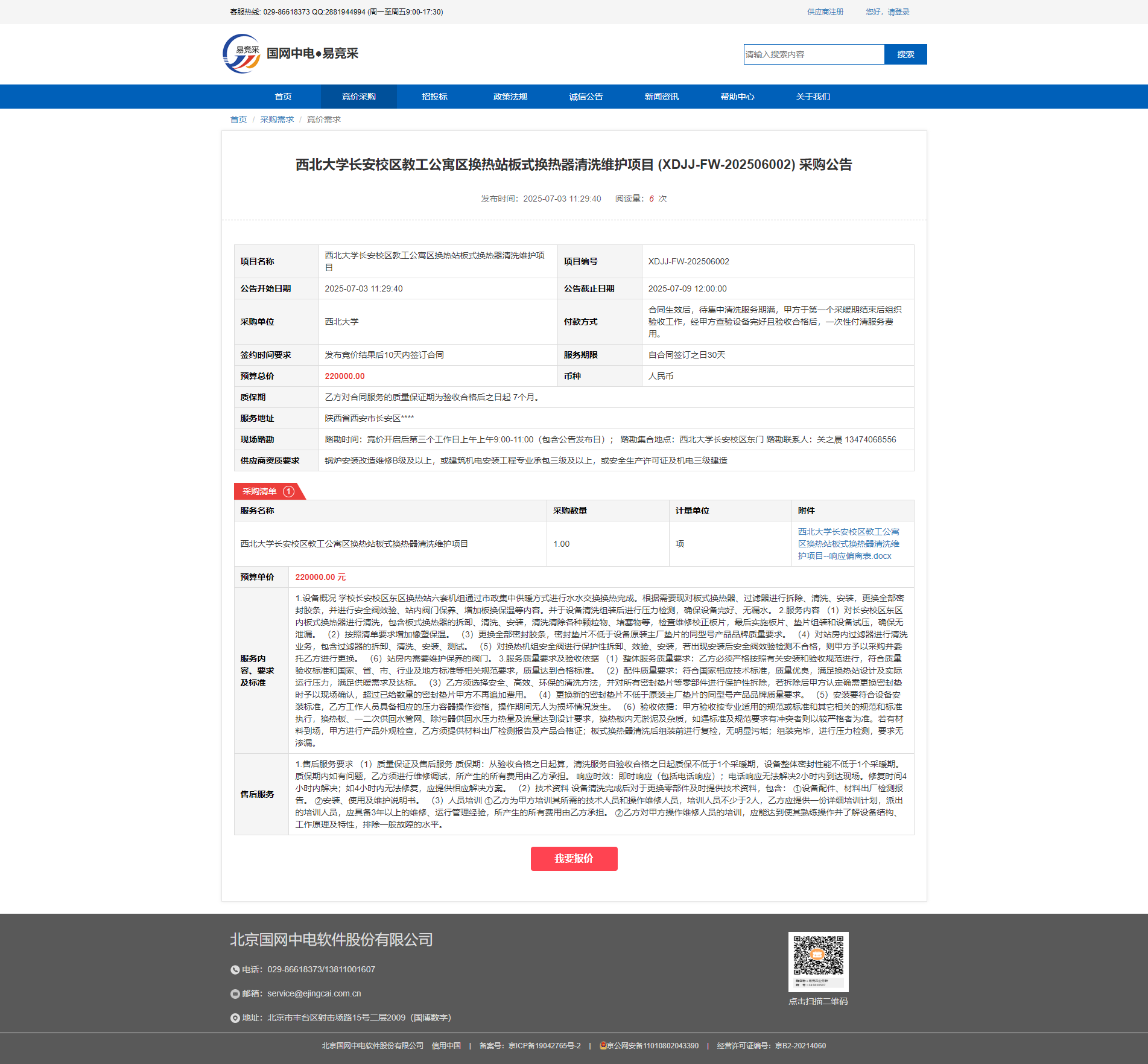 古天乐代言太阳集团城网址长安校区教工公寓区换热站板式换热器清洗维护项目 (XDJJ-FW-202506002) 采购公告