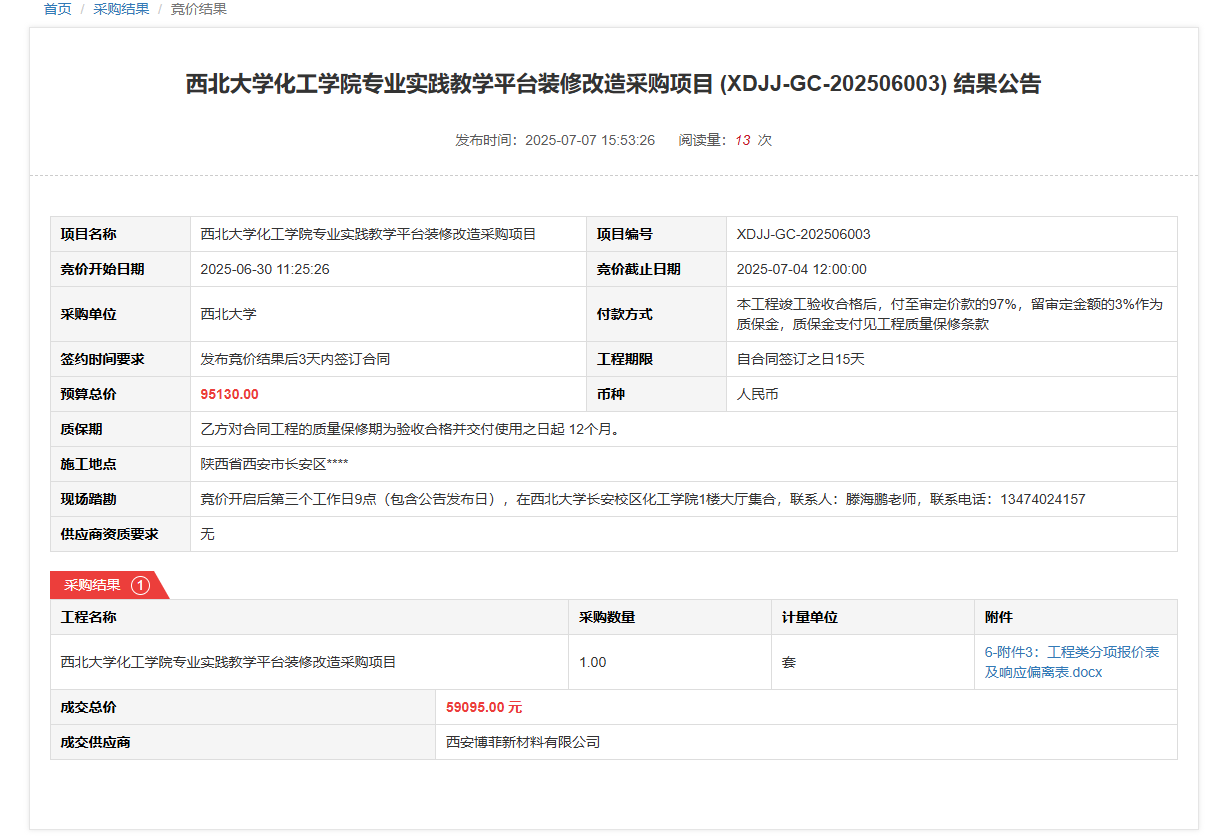 古天乐代言太阳集团城网址化工学院专业实践教学平台装修改造采购项目(XDJJ-GC-202506003)竞价结果公告