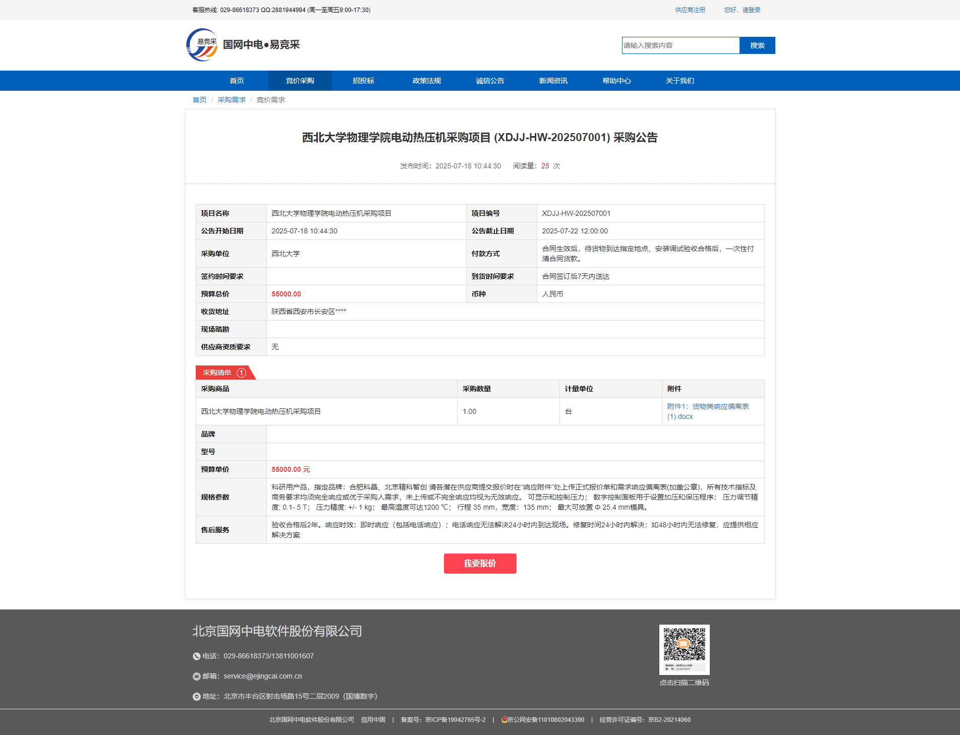 古天乐代言太阳集团城网址物理学院电动热压机采购项目(XDJJ-HW-202507001)竞价采购公告