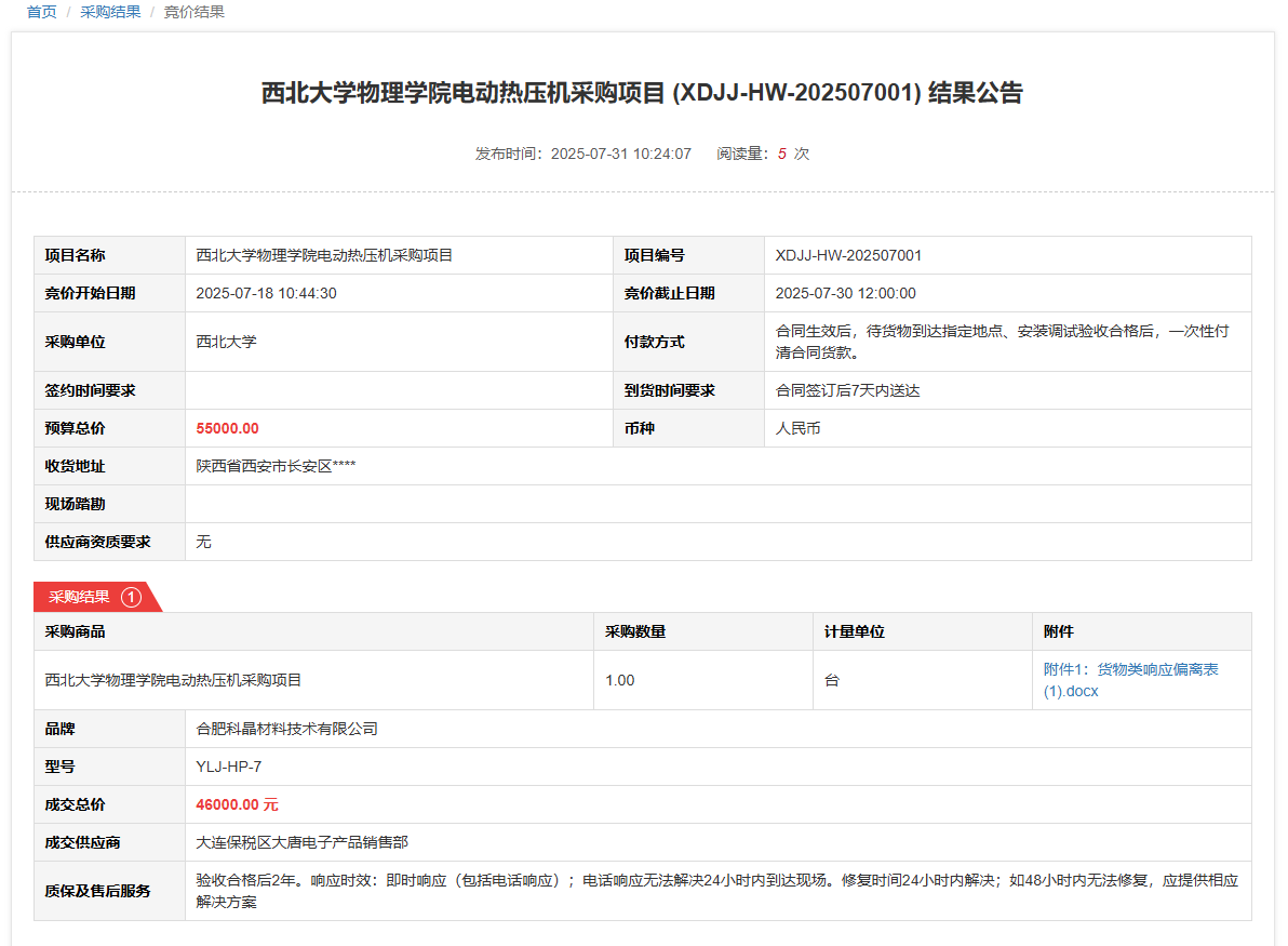 古天乐代言太阳集团城网址物理学院液相色谱仪采购项目(XDJJ-HW-202507002)竞价结果公告