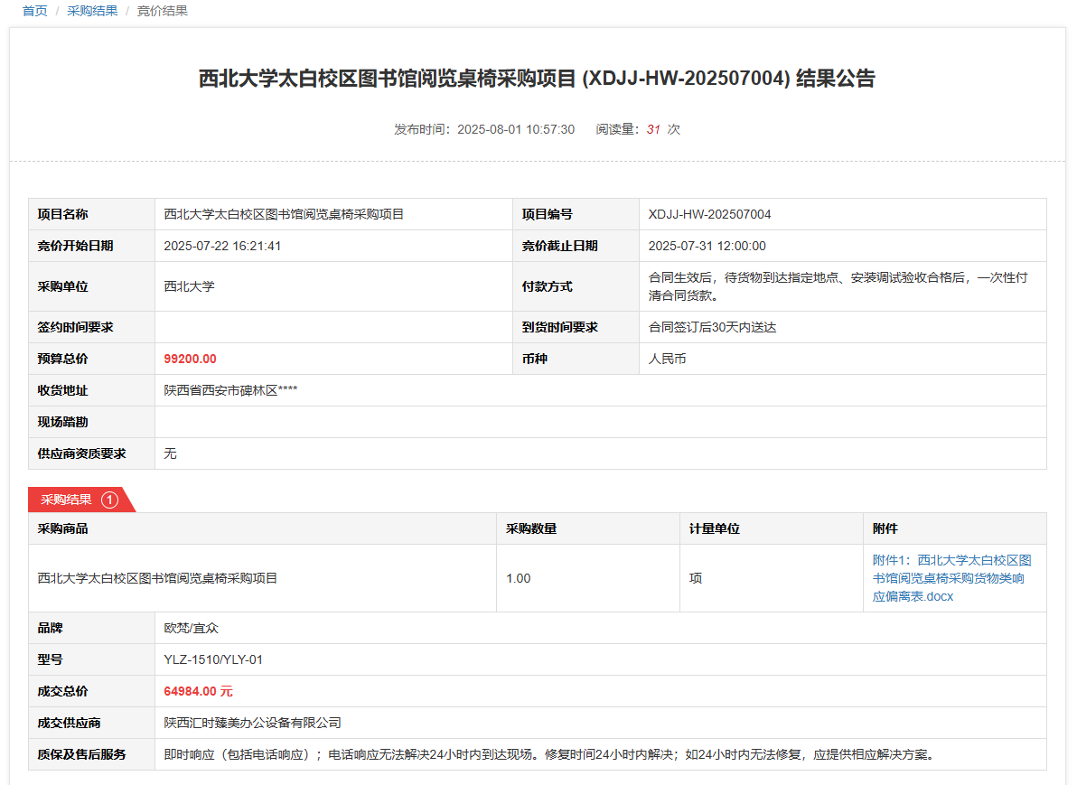 古天乐代言太阳集团城网址太白校区图书馆阅览桌椅采购项目(XDJJ-HW-202507004)竞价结果公告