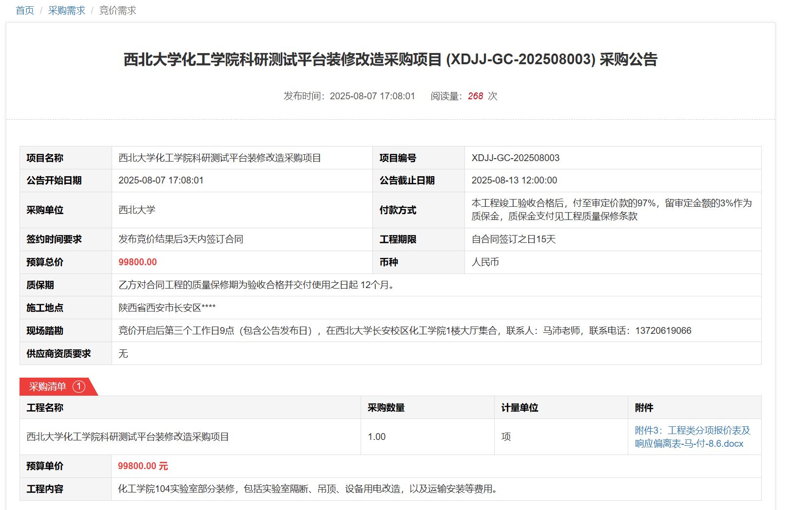 古天乐代言太阳集团城网址化工学院科研测试平台装修改造采购项目(XDJJ-GC-202508003)竞价采购公告