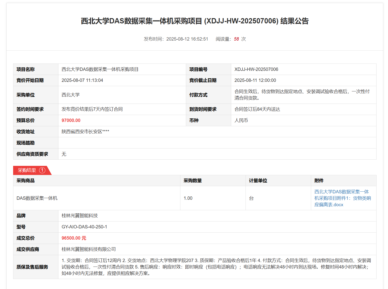 古天乐代言太阳集团城网址DAS数据采集一体机采购项目(XDJJ-HW-202507006)竞价结果公告