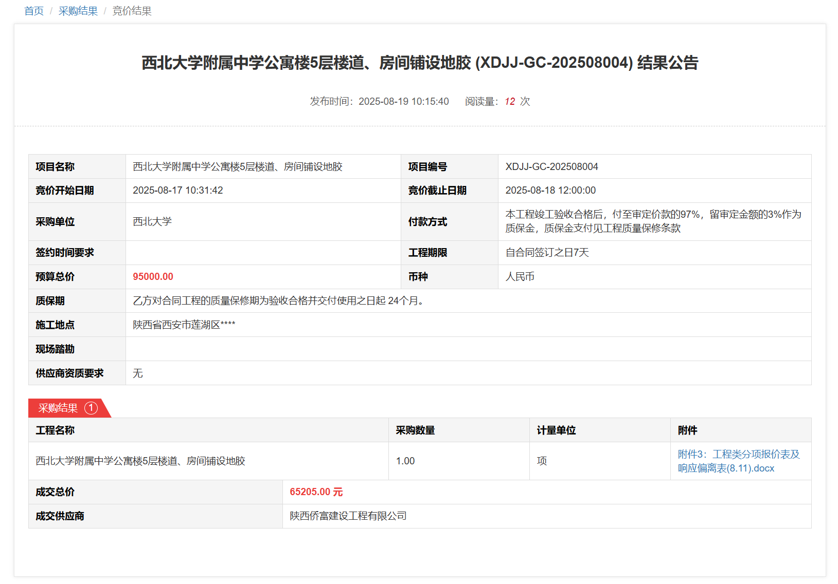 古天乐代言太阳集团城网址附属中学公寓楼5层楼道、房间铺设地胶(XDJJ-GC-202508004)竞价结果公告