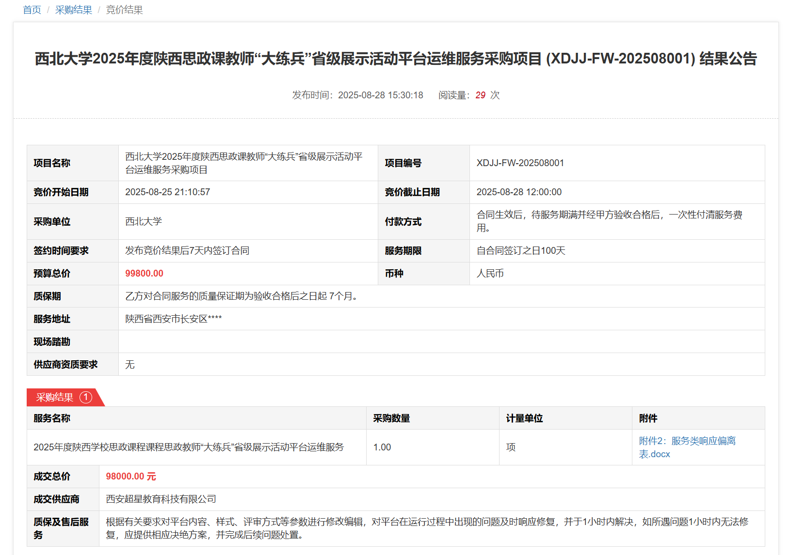 古天乐代言太阳集团城网址2025年度陕西思政课教师“大练兵”省级展示活动平台运维服务采购项目(XDJJ-FW-202508001)竞价结果公告