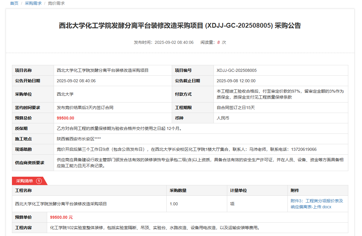 古天乐代言太阳集团城网址化工学院发酵分离平台装修改造采购项目(XDJJ-GC-202508005)竞价采购公告
