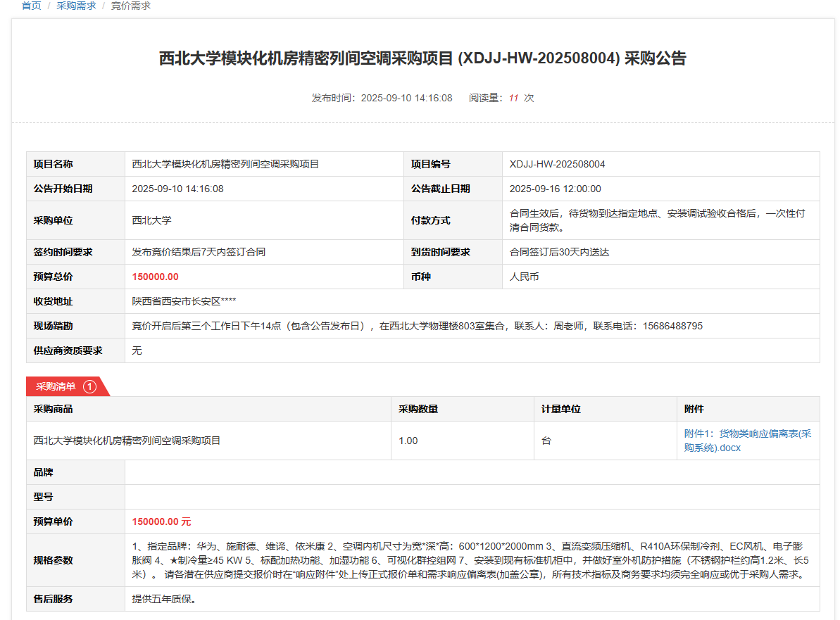 古天乐代言太阳集团城网址模块化机房精密列间空调采购项目(XDJJ-HW-202508004)竞价采购公告