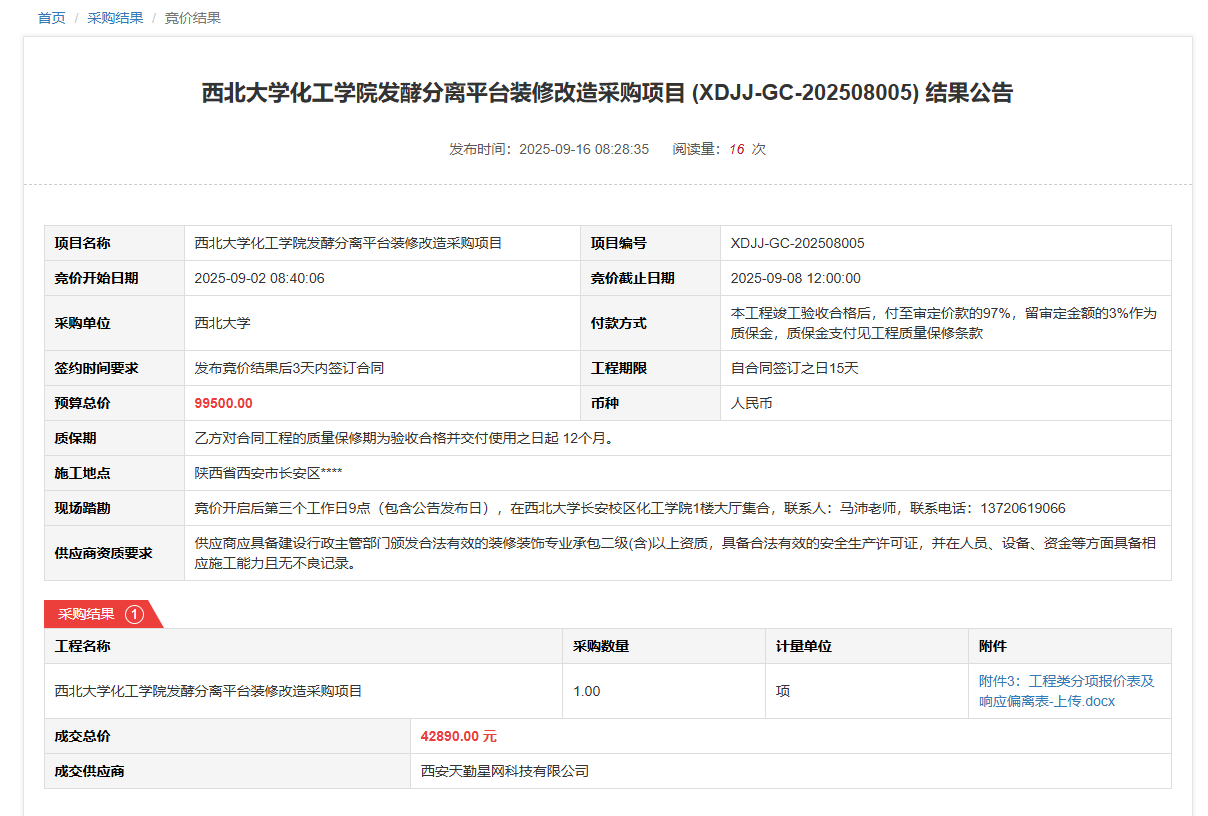 古天乐代言太阳集团城网址化工学院发酵分离平台装修改造采购项目(XDJJ-GC-202508005)竞价结果公告